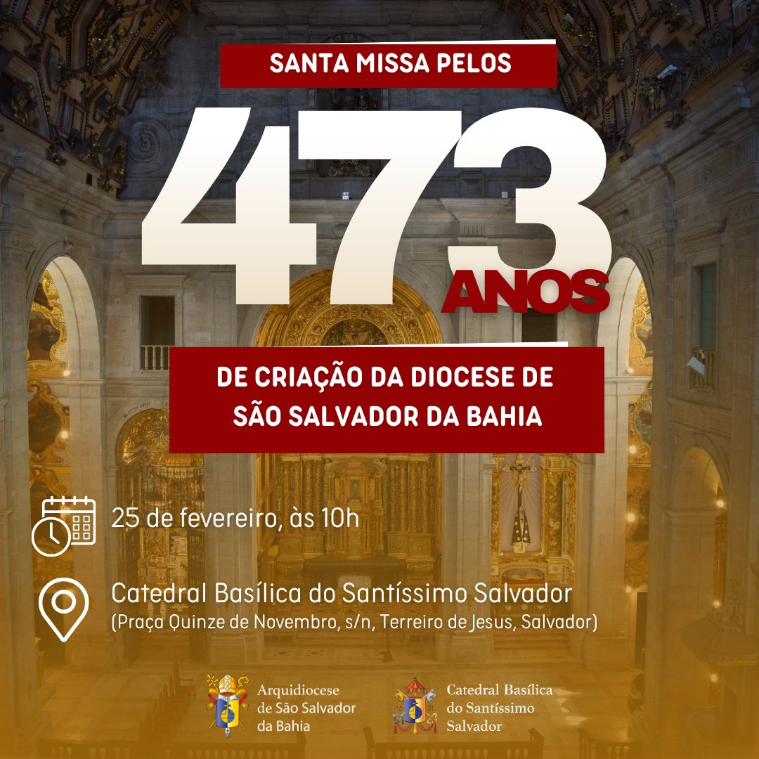 No próximo domingo, 25 de fevereiro, a Igreja no Brasil celebra os 473 anos de criação da primeira Diocese do país: São Salvador da Bahia. Para louvar e agradecer a Deus, o Cardeal Dom Sergio da Rocha presidirá a Santa Missa na Catedral Basílica do Santíssimo Salvador (Praça Quinze de Novembro, s/n, Centro Histórico), às 10h, com transmissão, em tempo real, pelo canal da Catedral: youtube.com/@catedralbasilicadesalvador