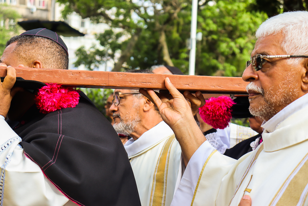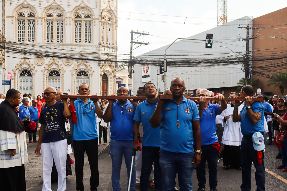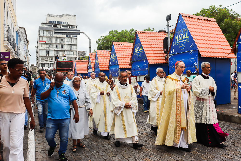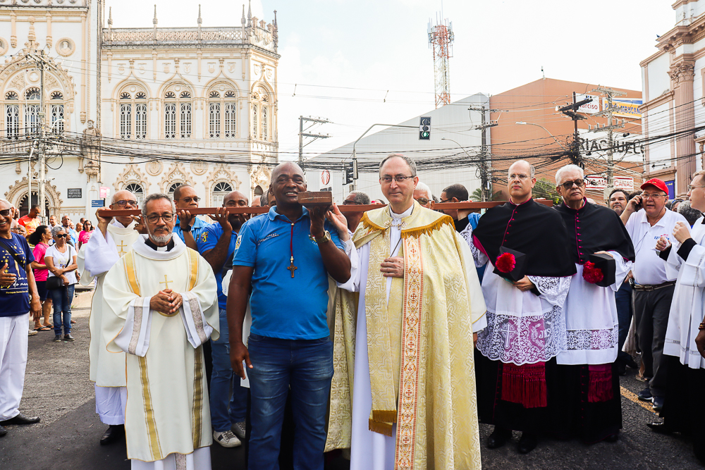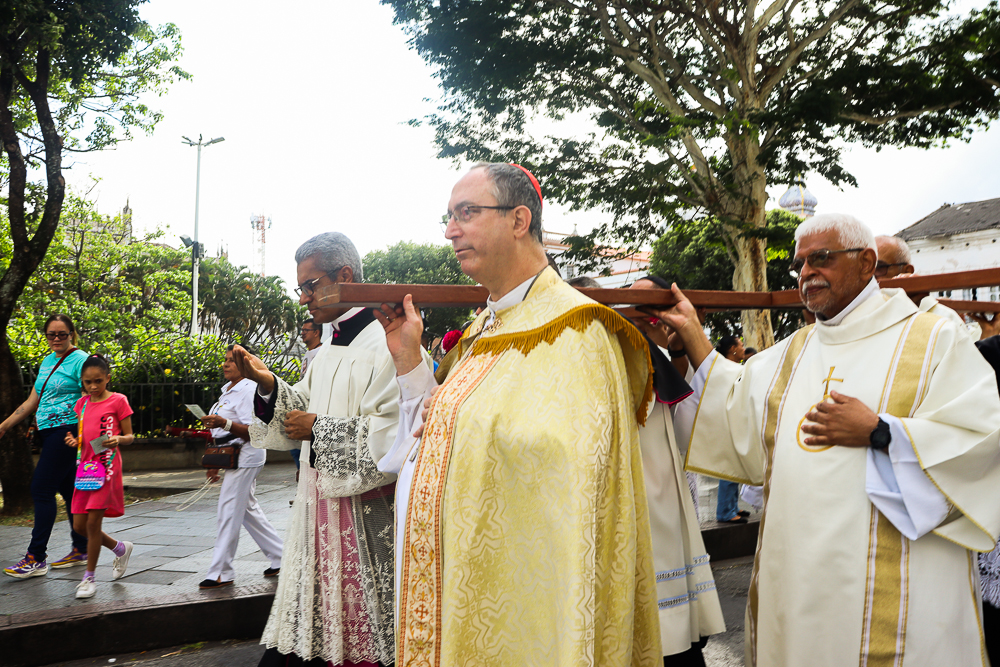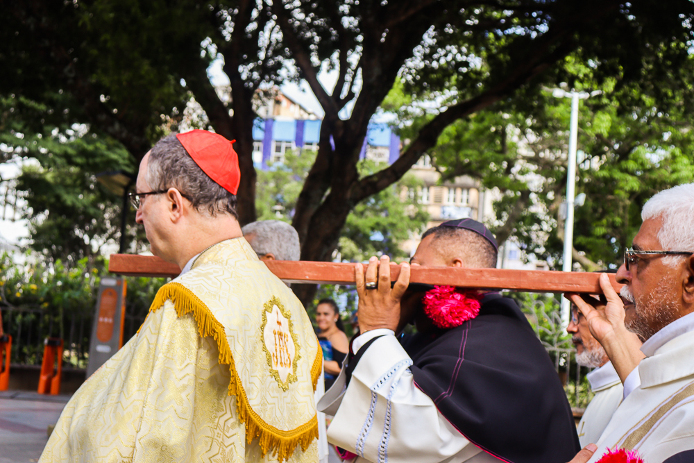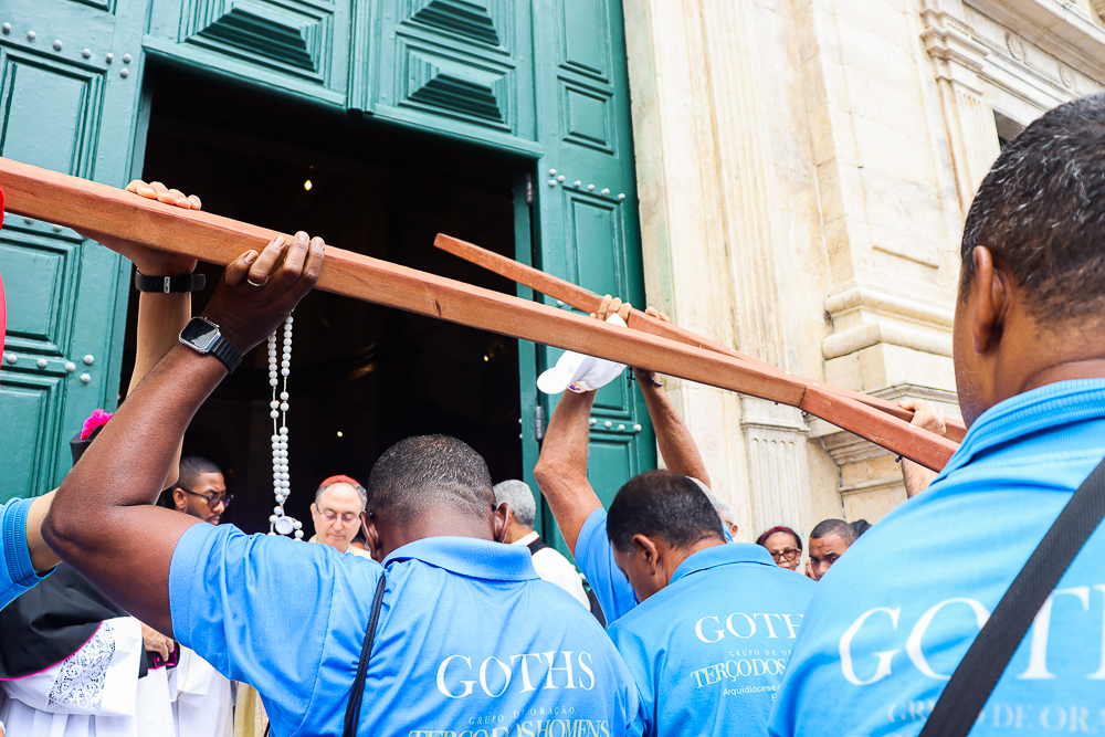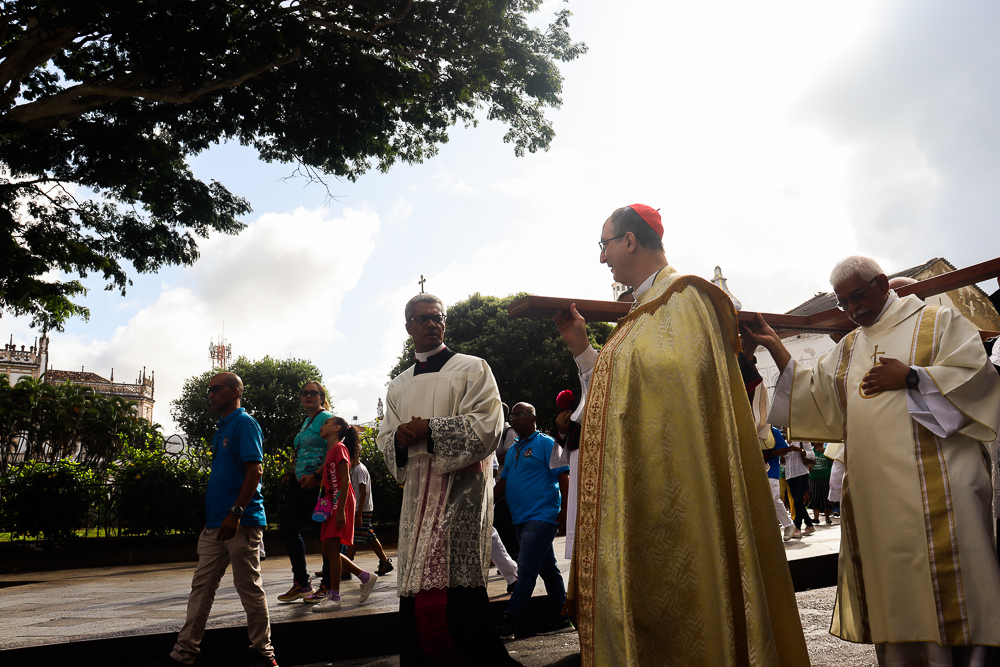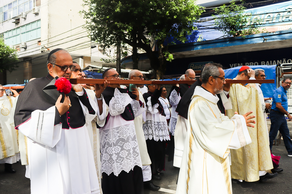 Carregada pelo Grupo de Oração Terço dos Homens, a cruz que irá peregrinar durante o Ano Santo – a mesma que será conduzida durante a Caminhada Penitencial – foi levada até o altar, e, logo em seguida, percorreu um trecho da Avenida Sete de Setembro até a Catedral Basílica do Santíssimo Salvador. No percurso, três paradas com temas específicos, para a leitura da Bula e a oração de um Salmo. A primeira delas foi em frente à Basílica Arquiabacial de São Sebastião (Mosteiro de São Bento), com o tema “reconciliação”, lida pelo vigário-geral da Arquidiocese de Salvador e moderador da Cúria Bom Pastor, padre Gabriel Filho; a segunda na Praça Castro Alves, com o tema “vida” e a leitura proferida pela jovem Vitória Paiva, representando o Setor Juventude; e a terceira em frente à Igreja da Misericórdia, sobre “as obras de misericórdia”, cuja leitura foi realizada pela Irmã Violeta.