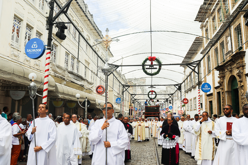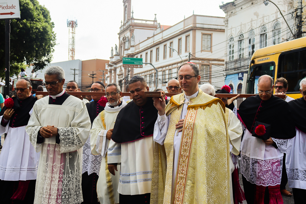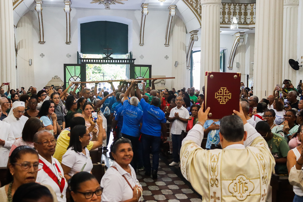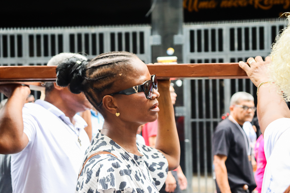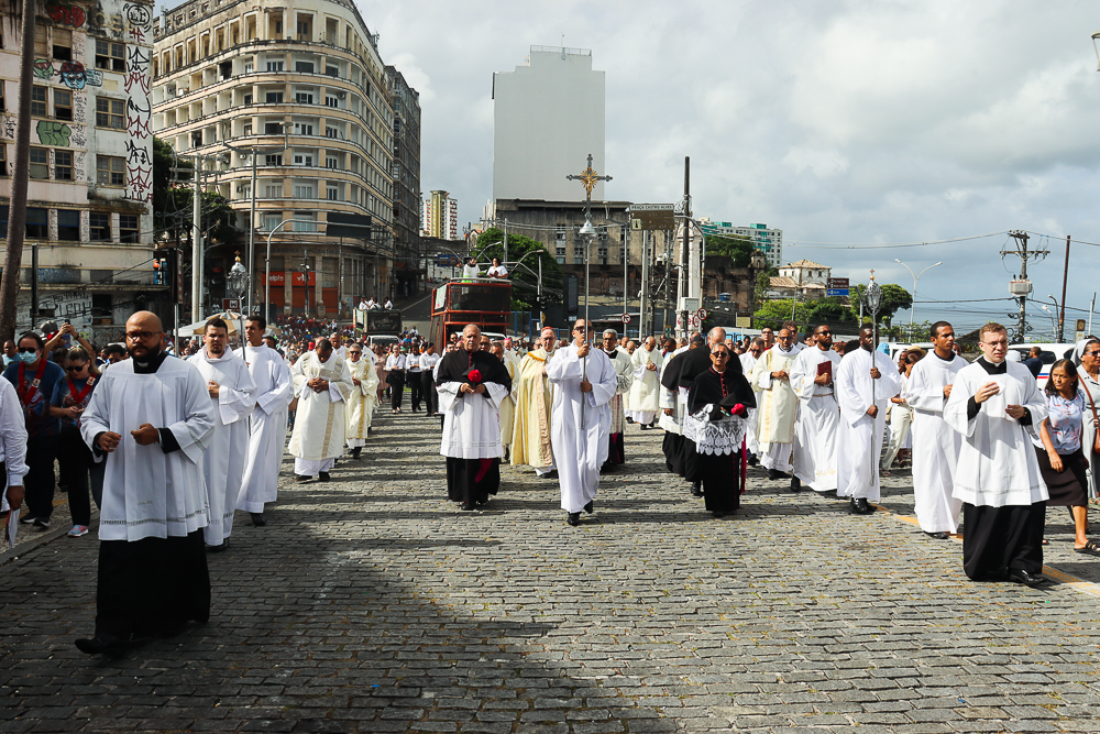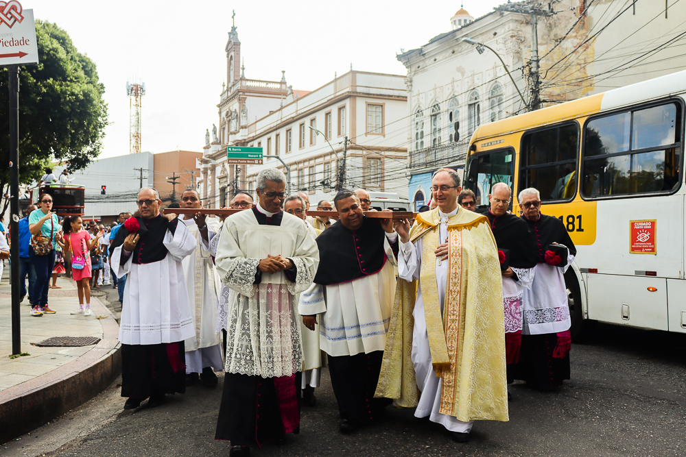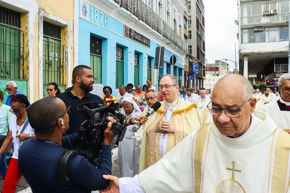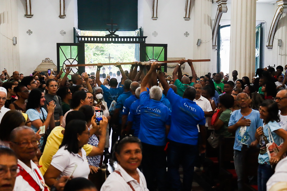 Carregada pelo Grupo de Oração Terço dos Homens, a cruz que irá peregrinar durante o Ano Santo – a mesma que será conduzida durante a Caminhada Penitencial – foi levada até o altar, e, logo em seguida, percorreu um trecho da Avenida Sete de Setembro até a Catedral Basílica do Santíssimo Salvador. No percurso, três paradas com temas específicos, para a leitura da Bula e a oração de um Salmo. A primeira delas foi em frente à Basílica Arquiabacial de São Sebastião (Mosteiro de São Bento), com o tema “reconciliação”, lida pelo vigário-geral da Arquidiocese de Salvador e moderador da Cúria Bom Pastor, padre Gabriel Filho; a segunda na Praça Castro Alves, com o tema “vida” e a leitura proferida pela jovem Vitória Paiva, representando o Setor Juventude; e a terceira em frente à Igreja da Misericórdia, sobre “as obras de misericórdia”, cuja leitura foi realizada pela Irmã Violeta.