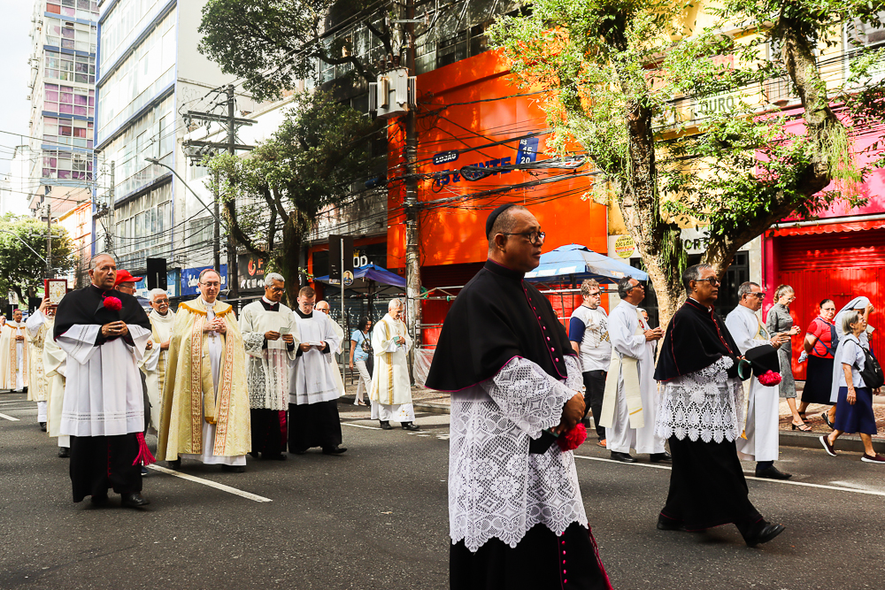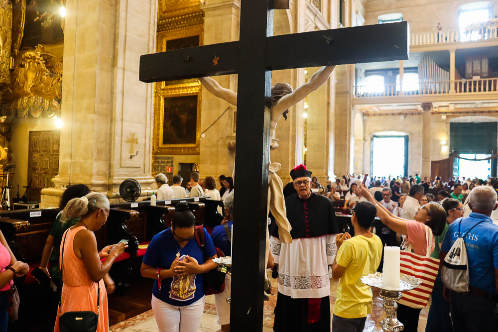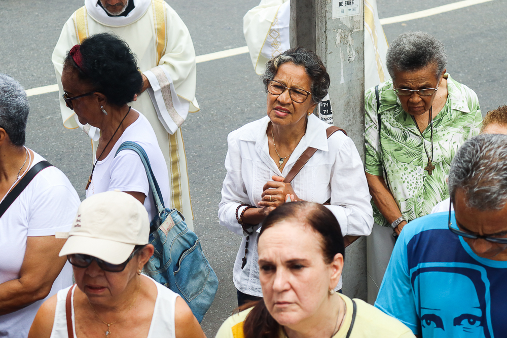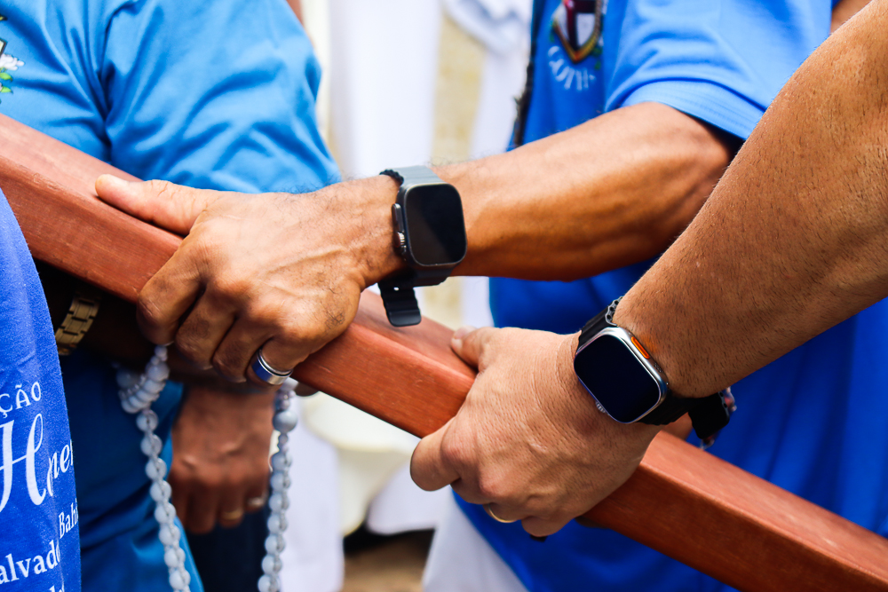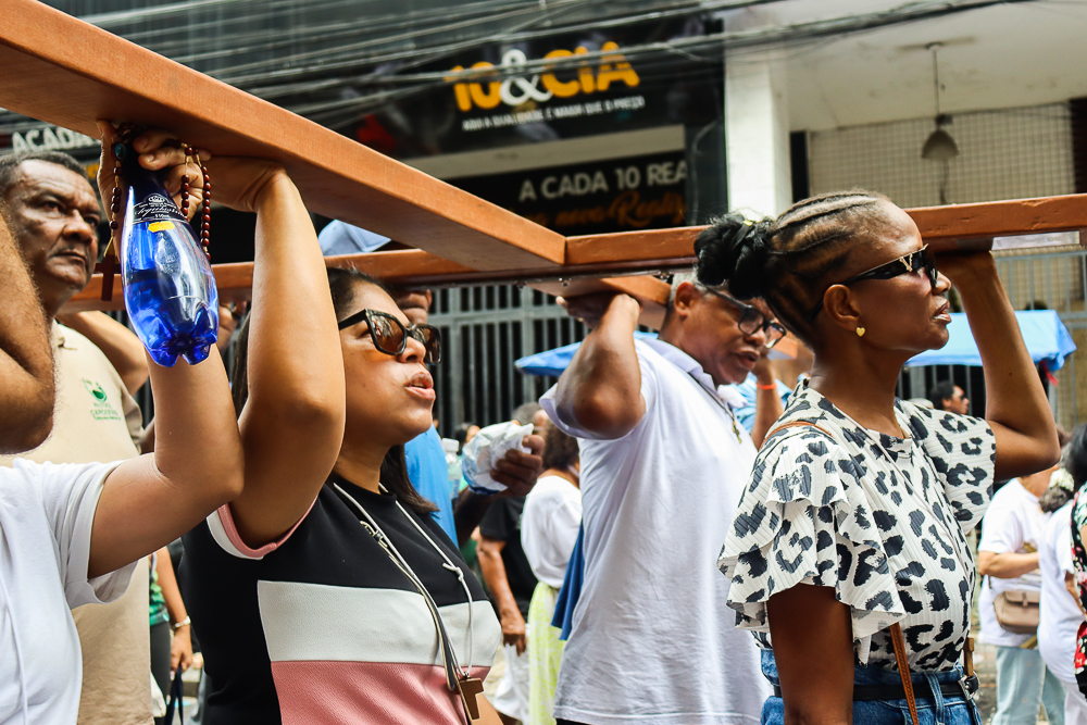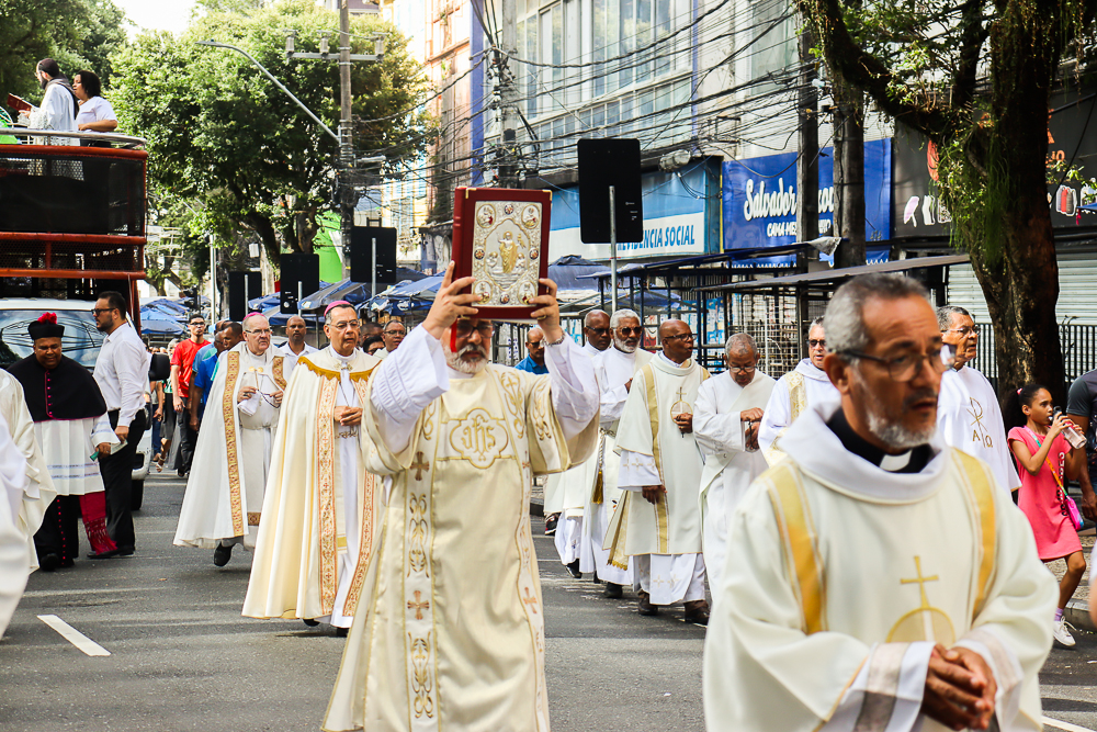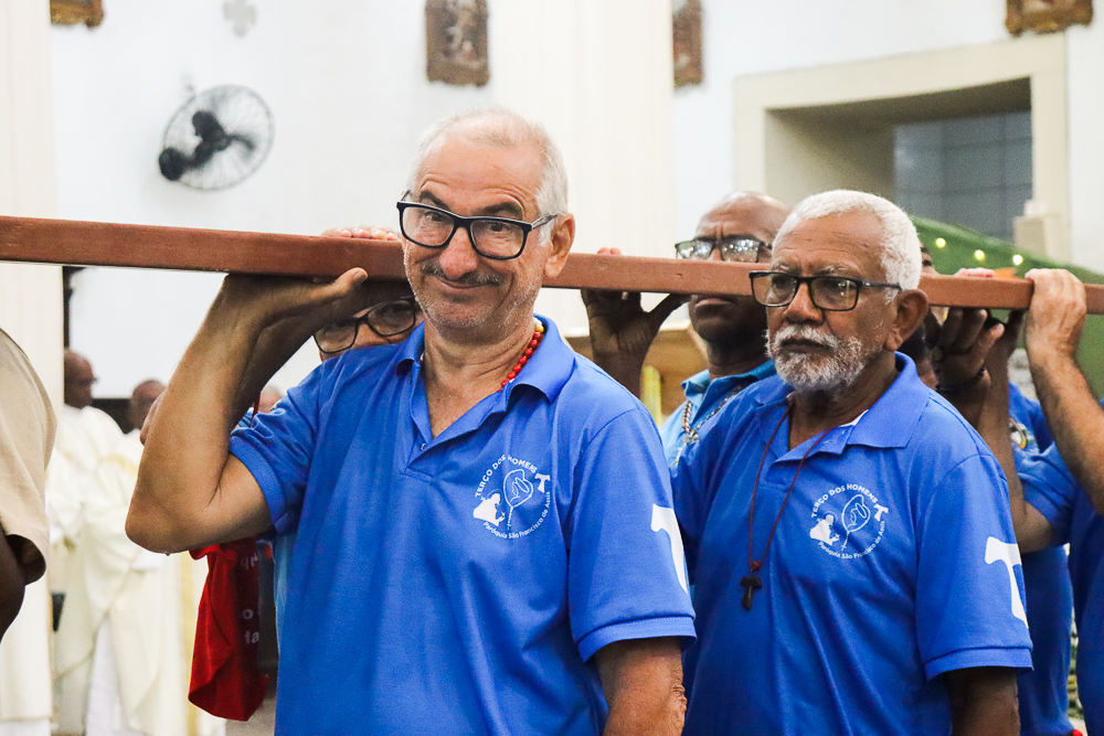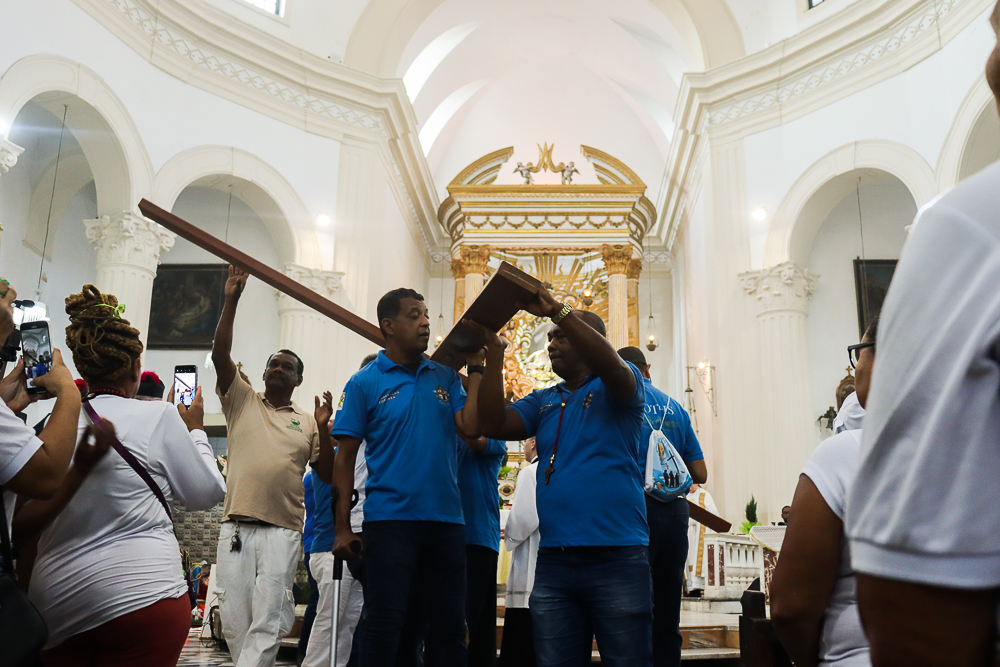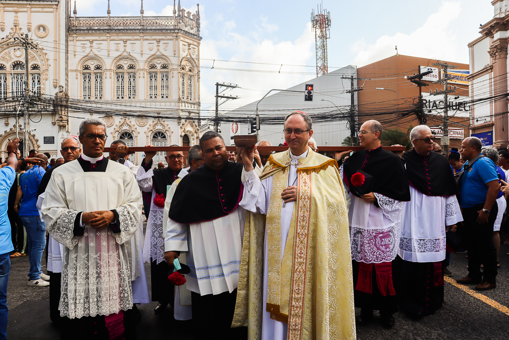 Carregada pelo Grupo de Oração Terço dos Homens, a cruz que irá peregrinar durante o Ano Santo – a mesma que será conduzida durante a Caminhada Penitencial – foi levada até o altar, e, logo em seguida, percorreu um trecho da Avenida Sete de Setembro até a Catedral Basílica do Santíssimo Salvador. No percurso, três paradas com temas específicos, para a leitura da Bula e a oração de um Salmo. A primeira delas foi em frente à Basílica Arquiabacial de São Sebastião (Mosteiro de São Bento), com o tema “reconciliação”, lida pelo vigário-geral da Arquidiocese de Salvador e moderador da Cúria Bom Pastor, padre Gabriel Filho; a segunda na Praça Castro Alves, com o tema “vida” e a leitura proferida pela jovem Vitória Paiva, representando o Setor Juventude; e a terceira em frente à Igreja da Misericórdia, sobre “as obras de misericórdia”, cuja leitura foi realizada pela Irmã Violeta.