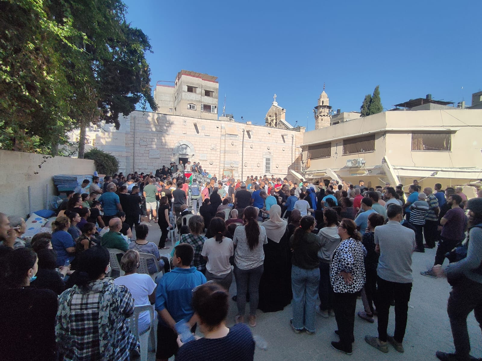 Há cerca de mil cristãos na Faixa de Gaza. A maioria deles está abrigada na paróquia católica Sagrada Família e na igreja greco-ortodoxa de São Porfírio. Centenas de famílias foram aglomeradas nos complexos da igreja, com relatos de escassez terrível de alimentos, remédios e água.