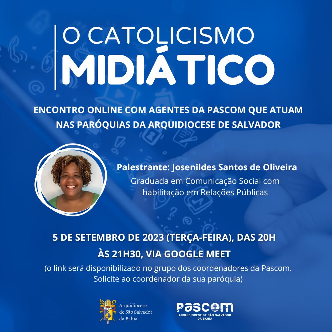 Os agentes da Pastoral da Comunicação (Pascom) que atuam nas paróquias da Arquidiocese de São Salvador da Bahia têm um compromisso marcado nesta terça-feira, 5 de setembro. A atividade, que terá como tema “O catolicismo midiático”, será conduzida pela relações públicas, Josenildes Santos de Oliveira, das 20h às 21h30.