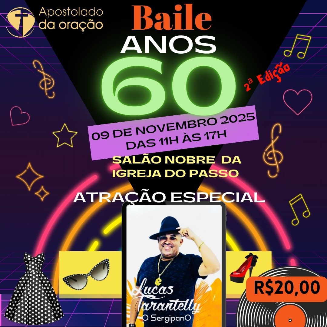 O clima retrô vai tomar conta do Salão Nobre da Igreja Santíssimo Sacramento da Rua do Passo, em Salvador, no dia 9 de novembro de 2025, quando o Apostolado da Oração realizará a 2ª edição do Baile Anos 60. O evento acontecerá das 11h às 17h e promete uma tarde animada, com muita música, dança e confraternização entre os participantes.