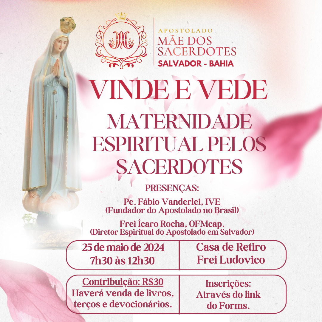 O Apostolado Mãe dos Sacerdotes, presente na Arquidiocese de São Salvador da Bahia, promoverá a primeira edição do evento “Vinde e vede – Maternidade Espiritual pelos Sacerdotes”, no próximo dia 25 de maio. O encontro acontecerá na Casa de Retiro Frei Ludovico e cada participante, após preencher a ficha de inscrição [disponível aqui] deverá contribuir com o valor de R$ 30 para ajudar nas despesas.