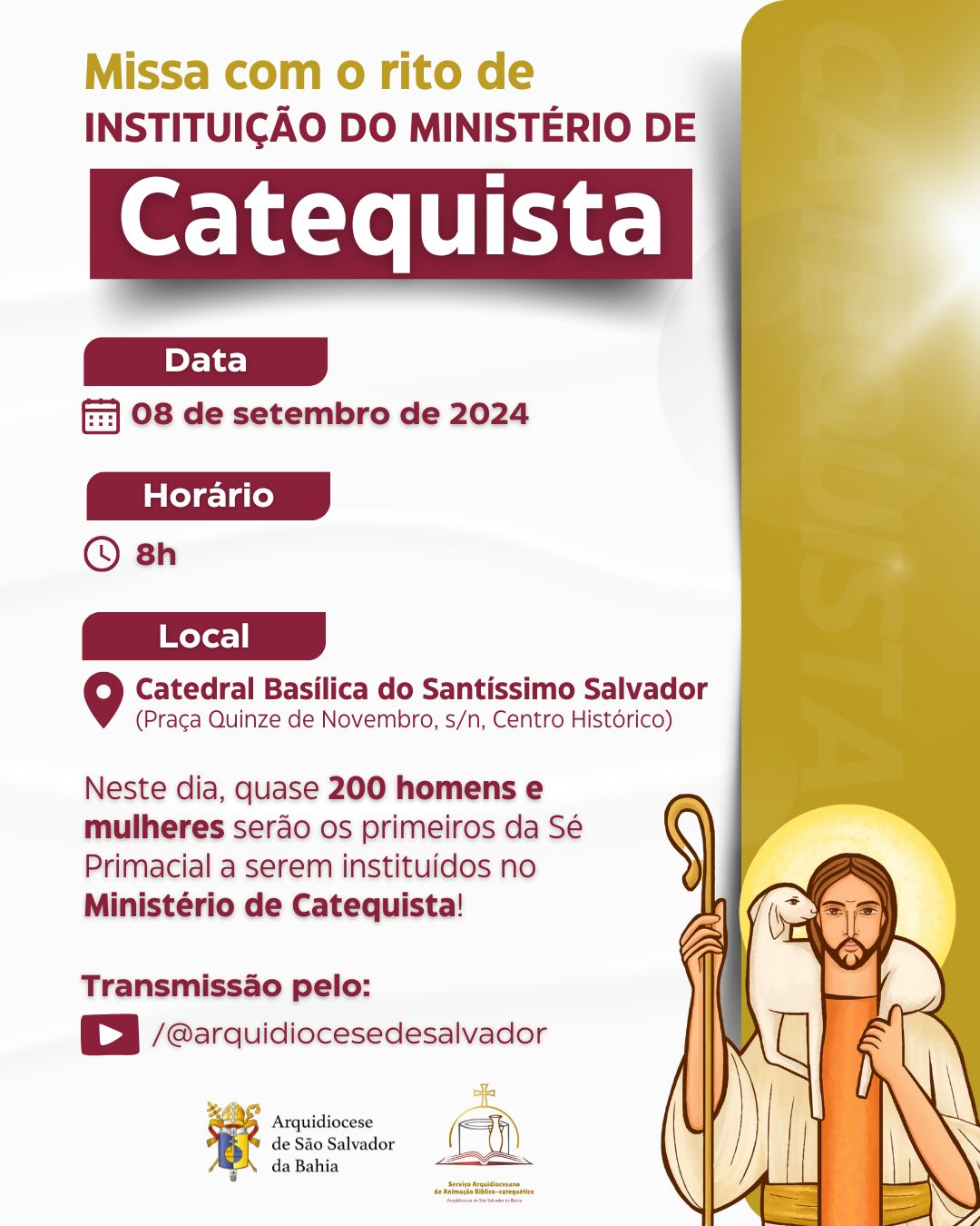 O dia 8 de setembro será marcante para a Igreja Primacial do país. Às 8h, o Arcebispo de São Salvador da Bahia, Primaz do Brasil, Cardeal Dom Sergio da Rocha, presidirá a Missa com o rito de instituição do Ministério de Catequista, que será conferido a quase 200 homens e mulheres que já se dedicam ao anúncio do Reino de Deus. A Celebração Eucarística acontecerá na Catedral Basílica do Santíssimo Salvador (Praça Quinze de Novembro, s/n, Centro Histórico), com transmissão ao vivo pelo canal youtube.com/@arquidiocesedesalvador