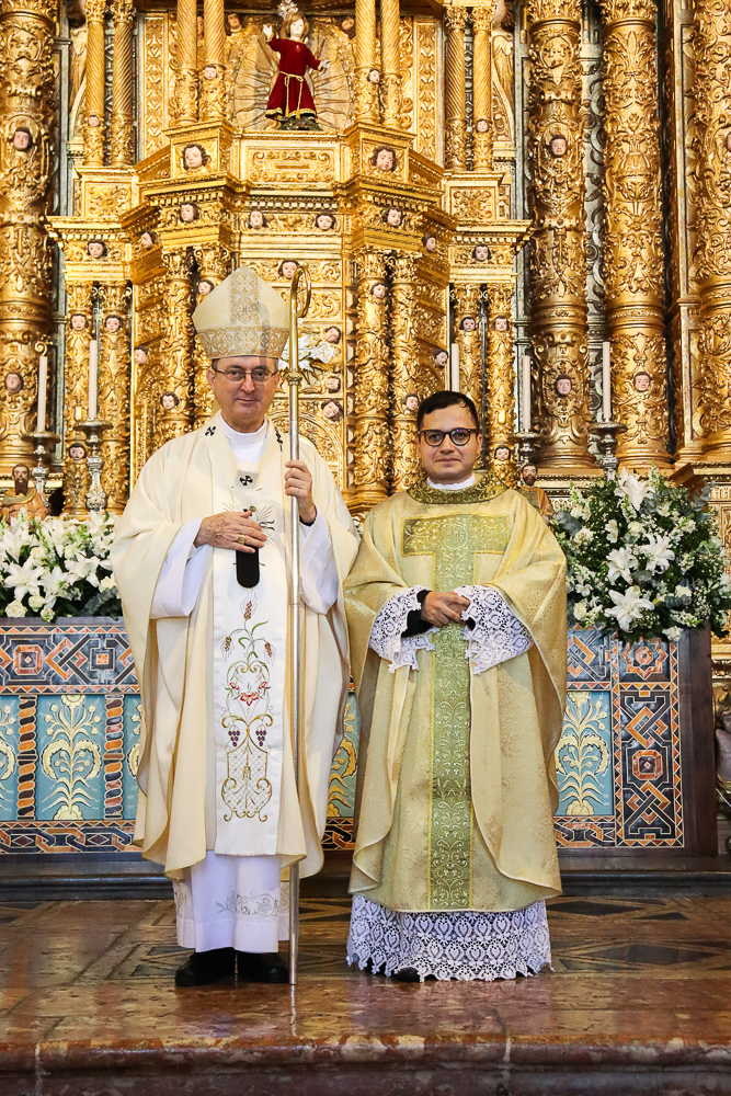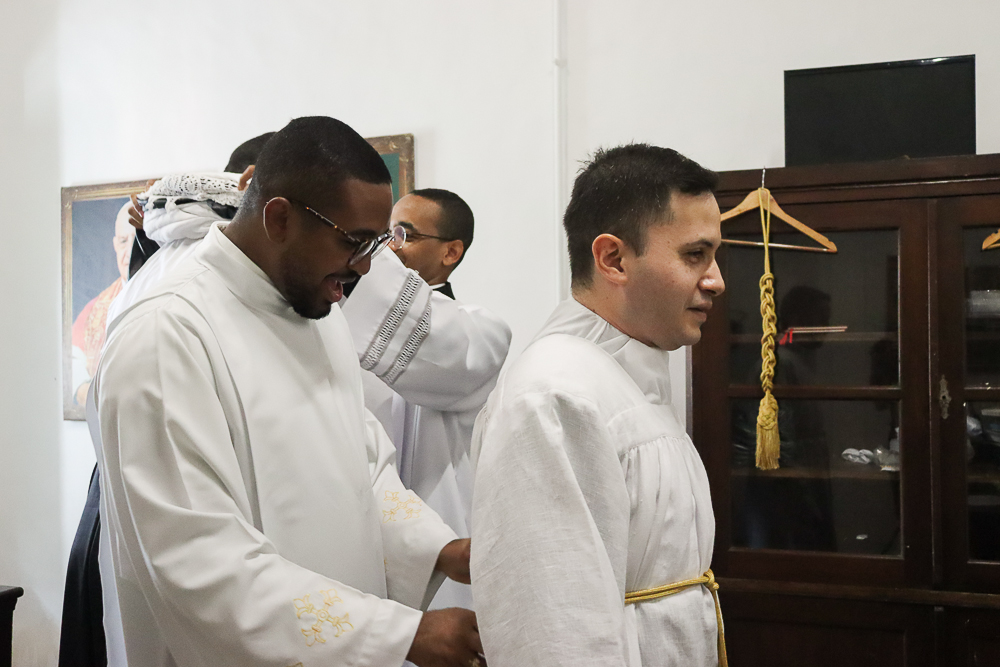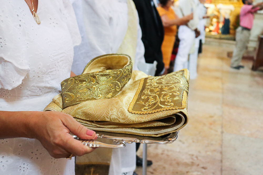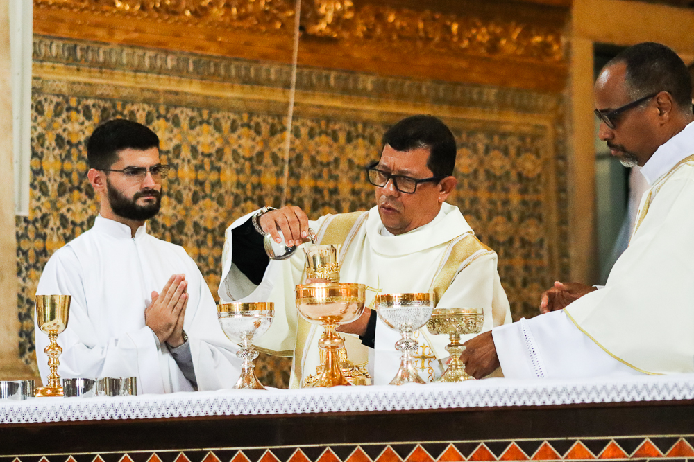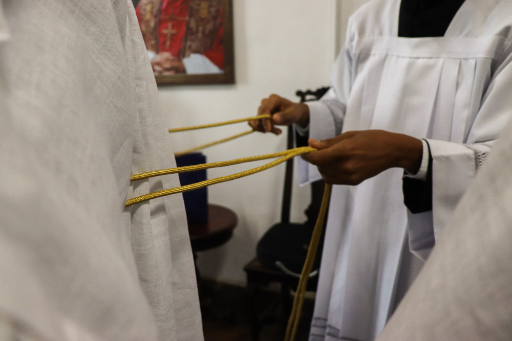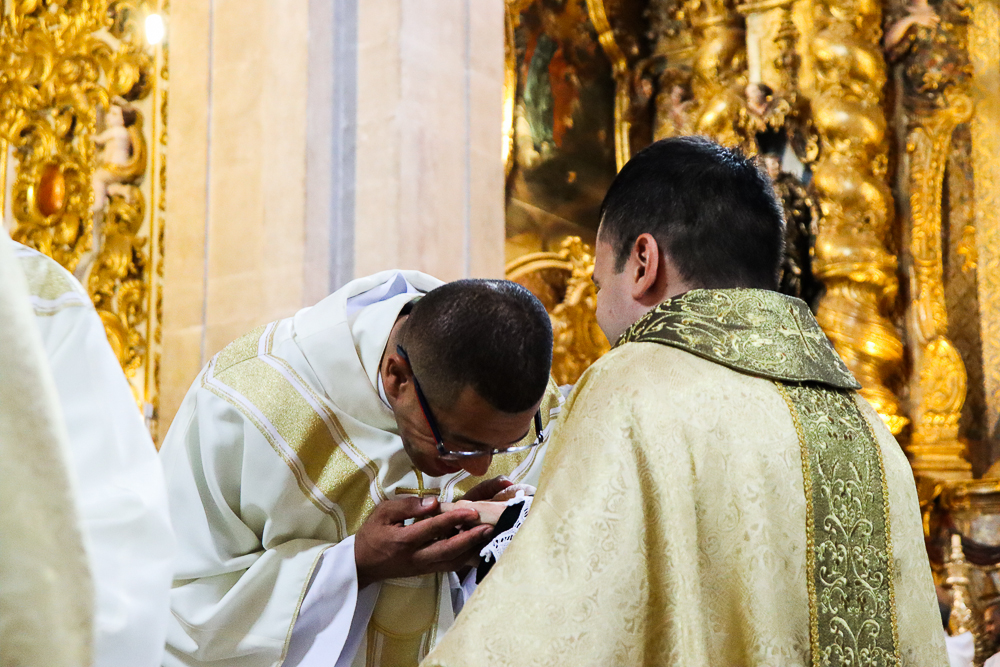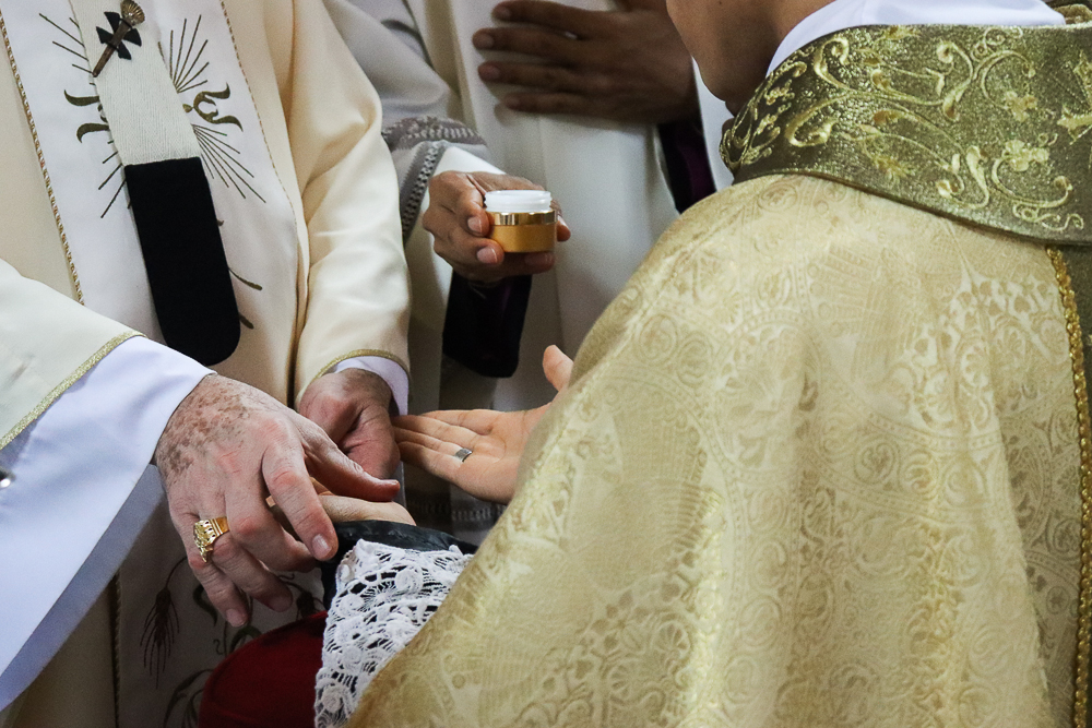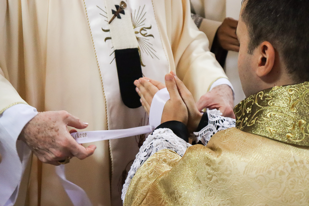 Terminada a Prece de Ordenação, foram retiradas as vestes diaconais e os neossacerdotes foram revestidos com a estola sacerdotal e a casula, vestes próprias do grau do presbiterato. Seguindo o rito próprio da Ordenação Presbiteral, o Arcebispo ungiu as mãos de cada um e as envolveu com uma faixa branca, que foi desatada por aqueles a quem cada um dos neossacerdotes deseja dar a sua primeira bênção sacerdotal, que foram os pais do padre Lucas e a madrinha e o pai do padre Luís Otávio.