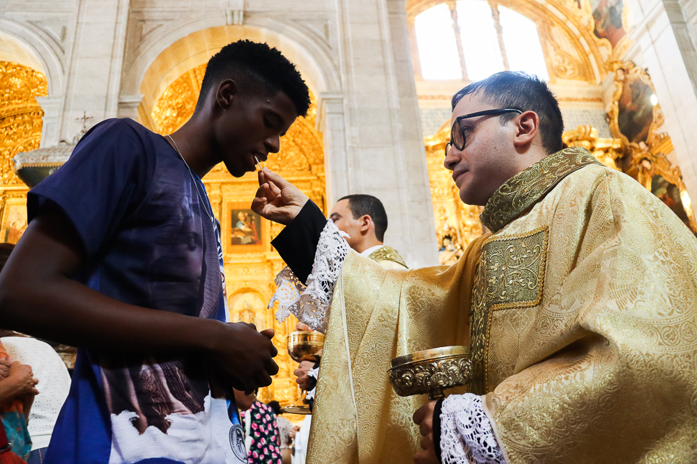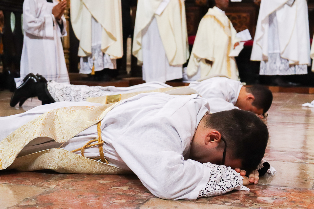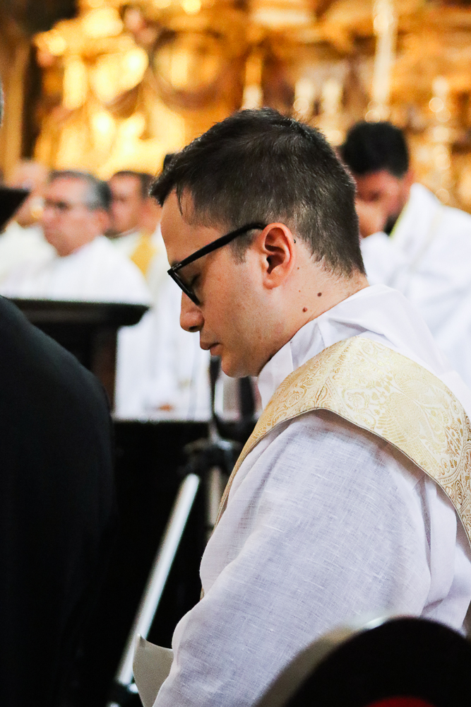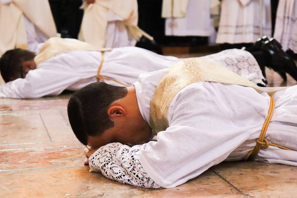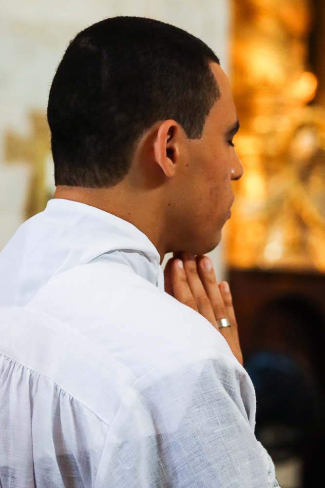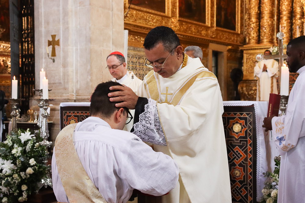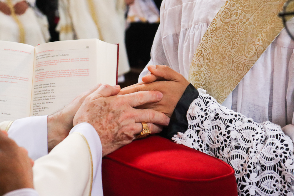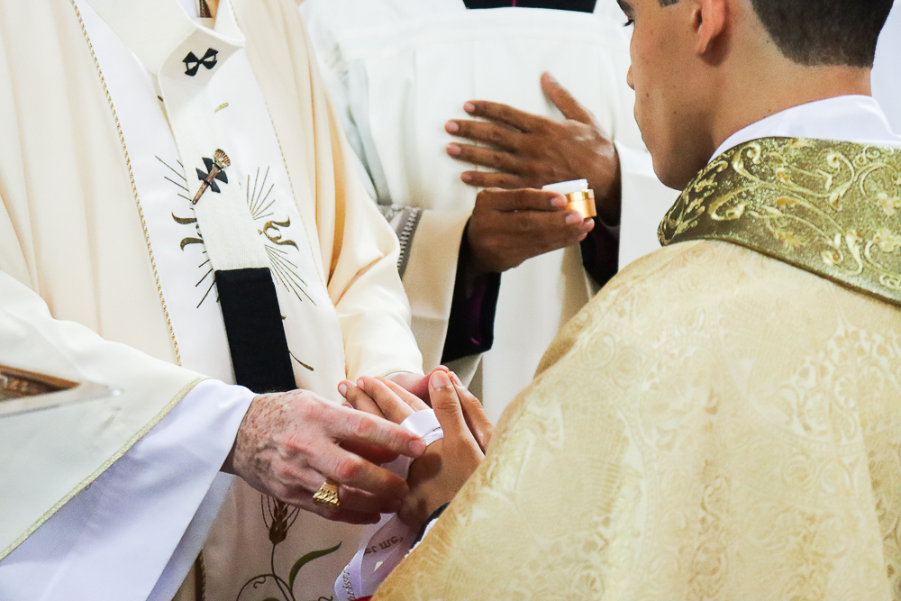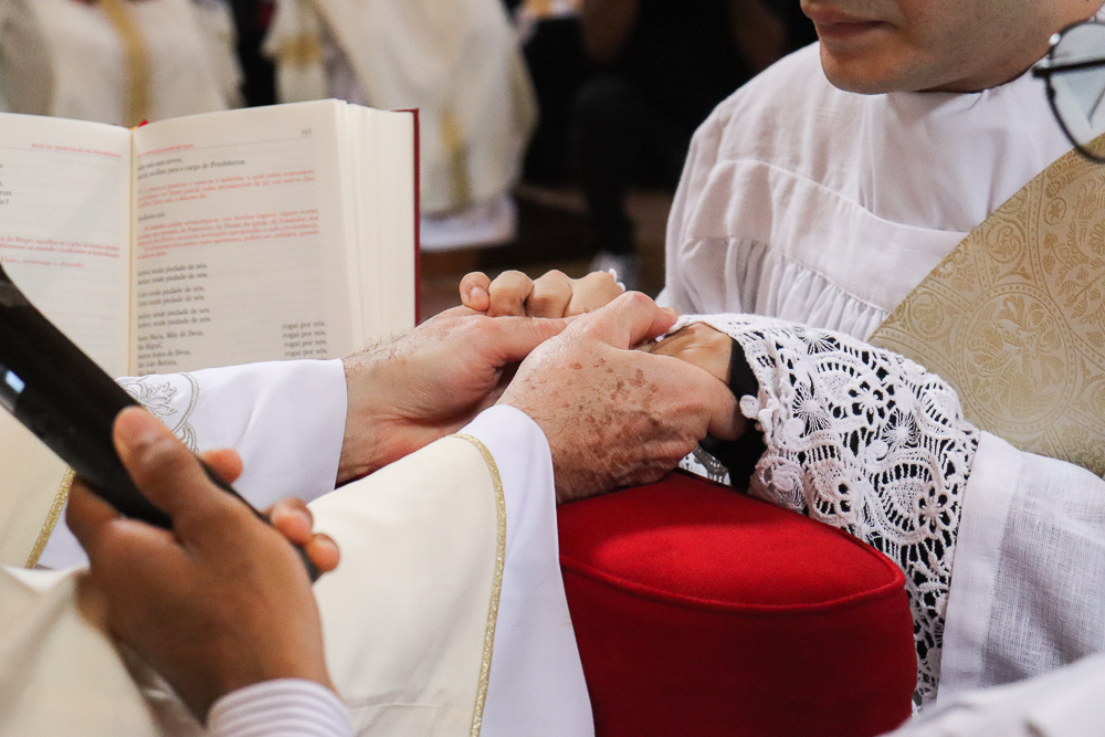 Em silêncio, os jovens receberam a imposição das mãos do Arcebispo e dos padres. Neste momento, por meio do gesto do Cardeal e da Oração Consacratória, o Espírito Santo os configurou a Cristo Sacerdote. Este é o ápice da celebração, um momento de profunda comunhão com o ministério do sacerdote.