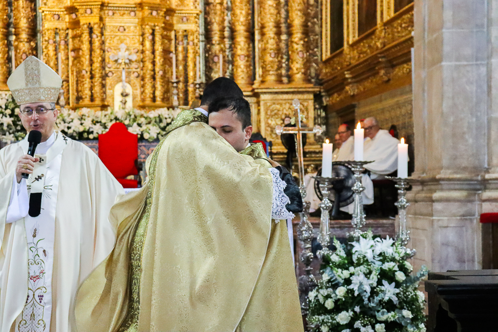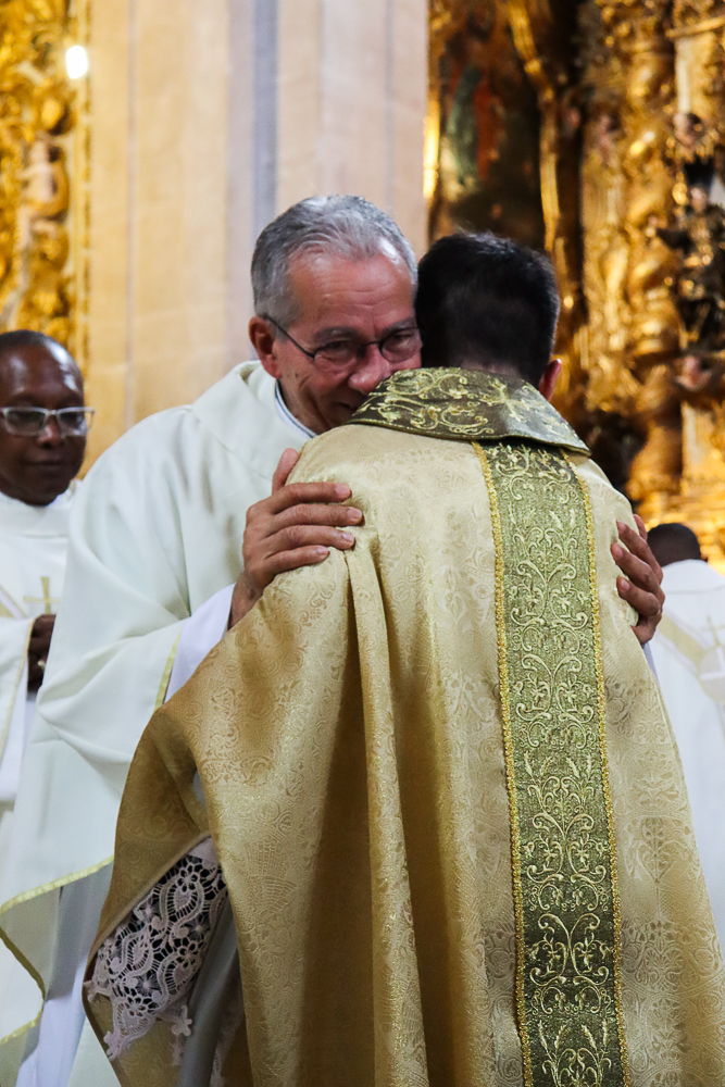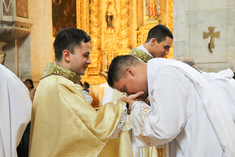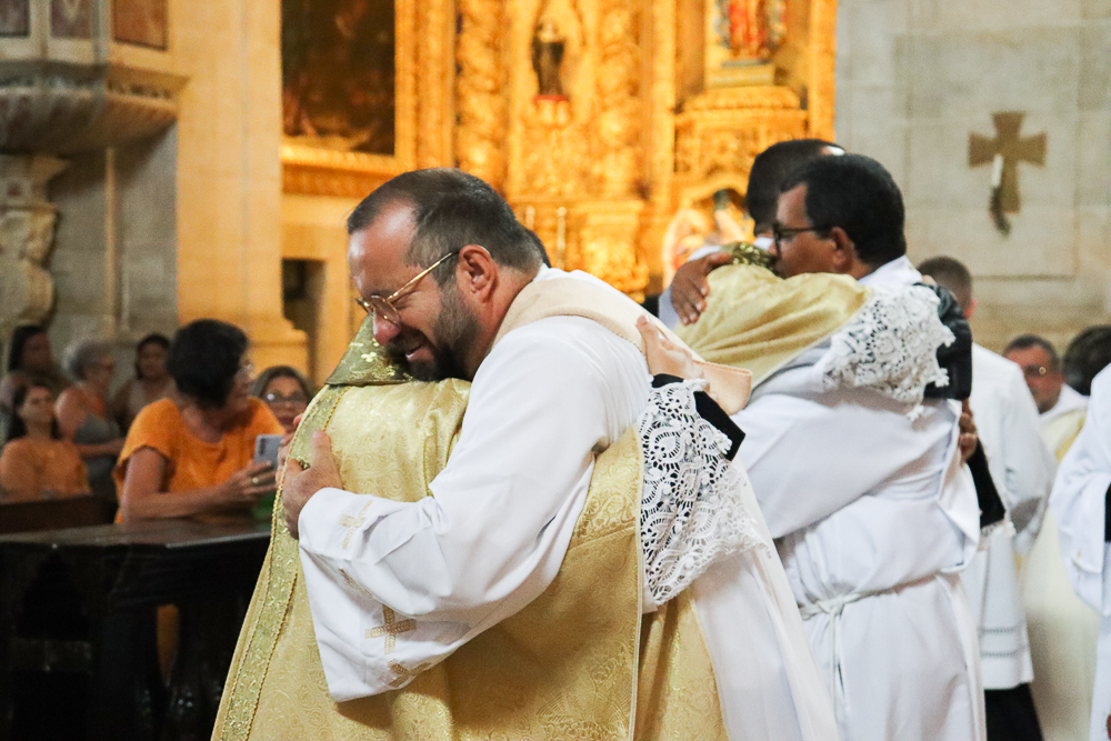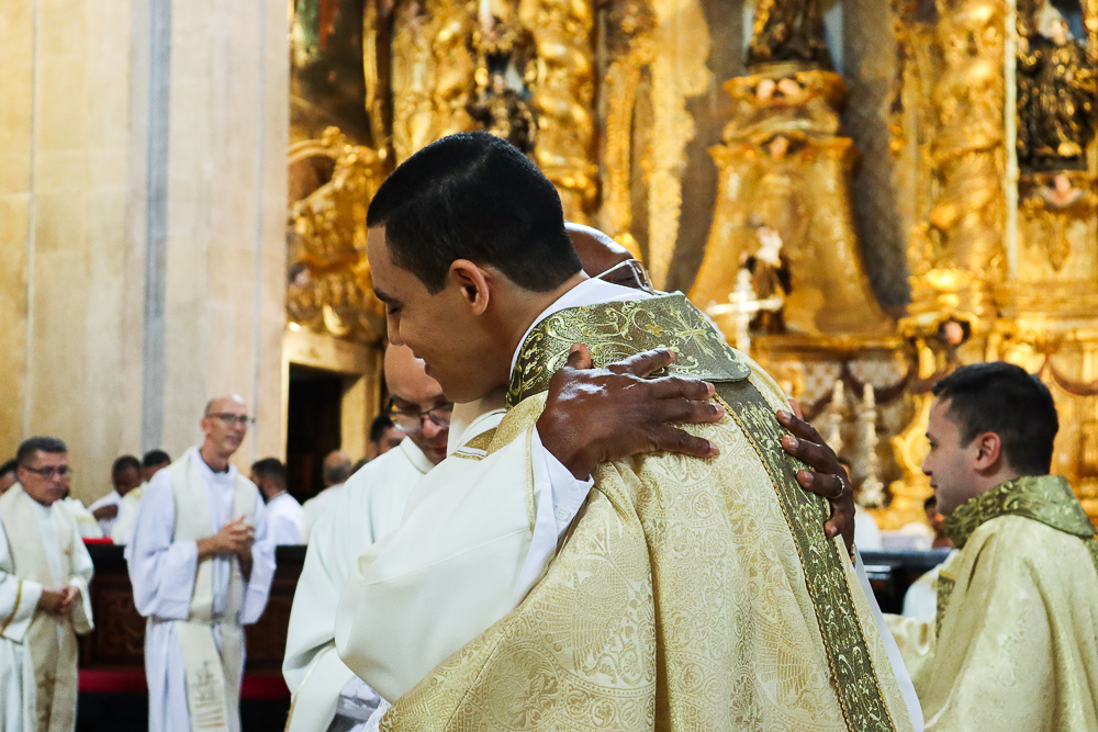 Com alegria, o presbitério da Arquidiocese acolheu seus novos membros, beijando as mãos ungidas dos neossacerdotes e os saudando com afetuosos abraços.