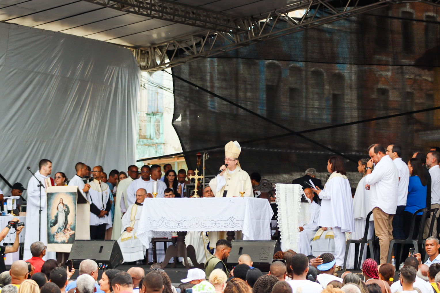 “A Celebração da Imaculada Conceição é de especial importância pelo Dogma Mariano, representando a Conceição Imaculada de Maria em vista de Jesus, por causa de Jesus. Mas, também, nós temos a graça de celebrar aqui Nossa Senhora da Conceição da Praia, este título muito querido aqui em Salvador, na Bahia, lembrando que Nossa Senhora é a Mãe de todos, é Senhora de todos, mas, especialmente, é Mãe e Senhora de tantos baianos, de tantos soteropolitanos que aqui vêm rezar neste templo, nesta Igreja tão querida, a Basílica Santuário Nossa Senhora da Conceição da Praia”, disse o Cardeal.