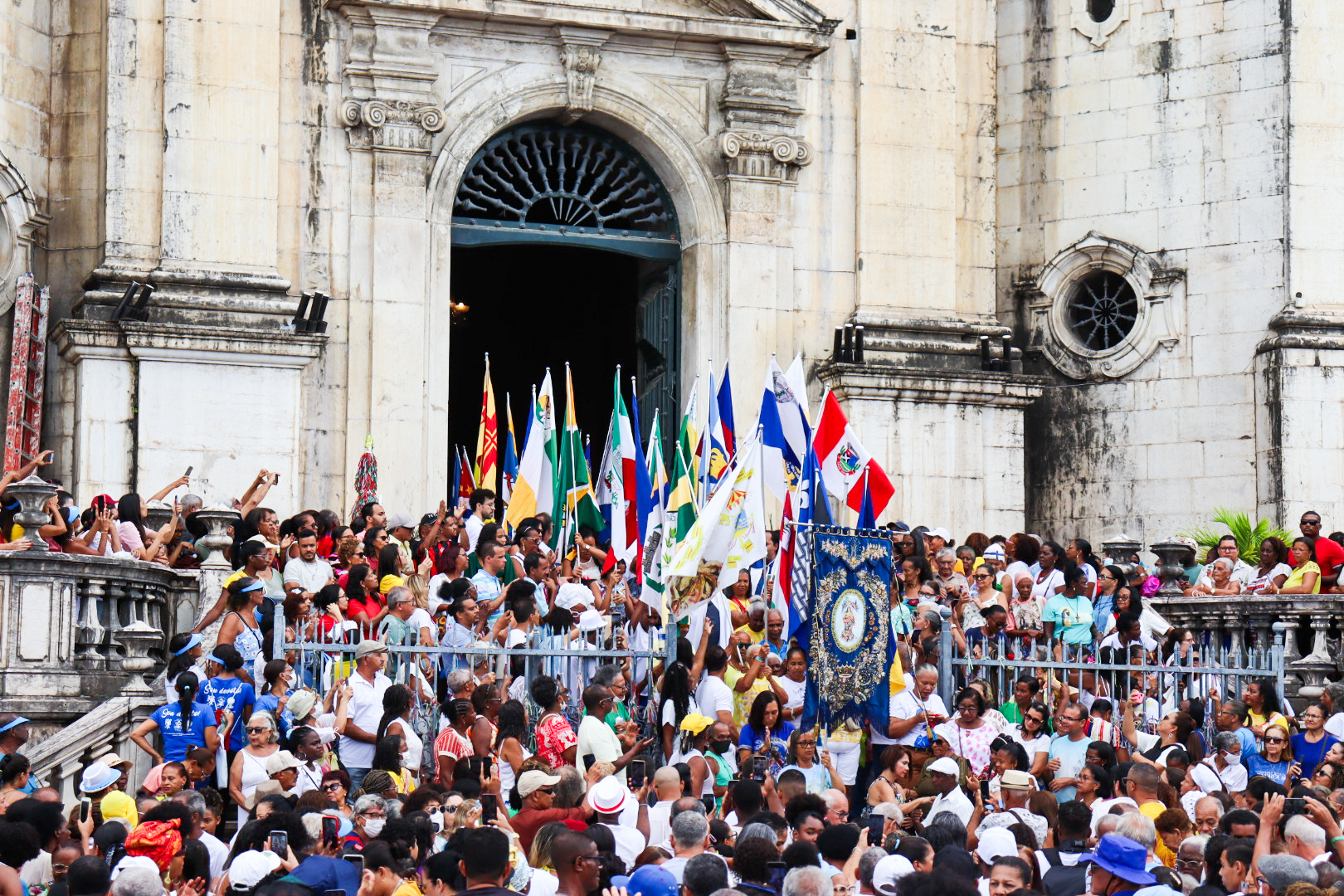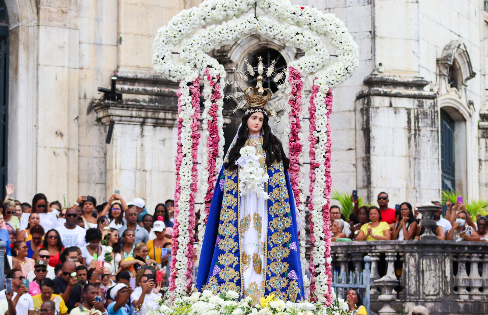 Logo após a bênção final, concedida pelas mãos de Dom Sergio, teve início a procissão. De dentro da Basílica saíram as bandeiras dos 417 municípios baianos. Em seguida, foram carregados os andores com imagens de Deus Menino, Santa Dulce dos Pobres, Nossa Senhora das Candeias, Nossa Senhora de Fátima, São José, Senhor Bom Jesus do Bonfim e, fechando a procissão, a imagem de Nossa Senhora da Conceição da Praia.