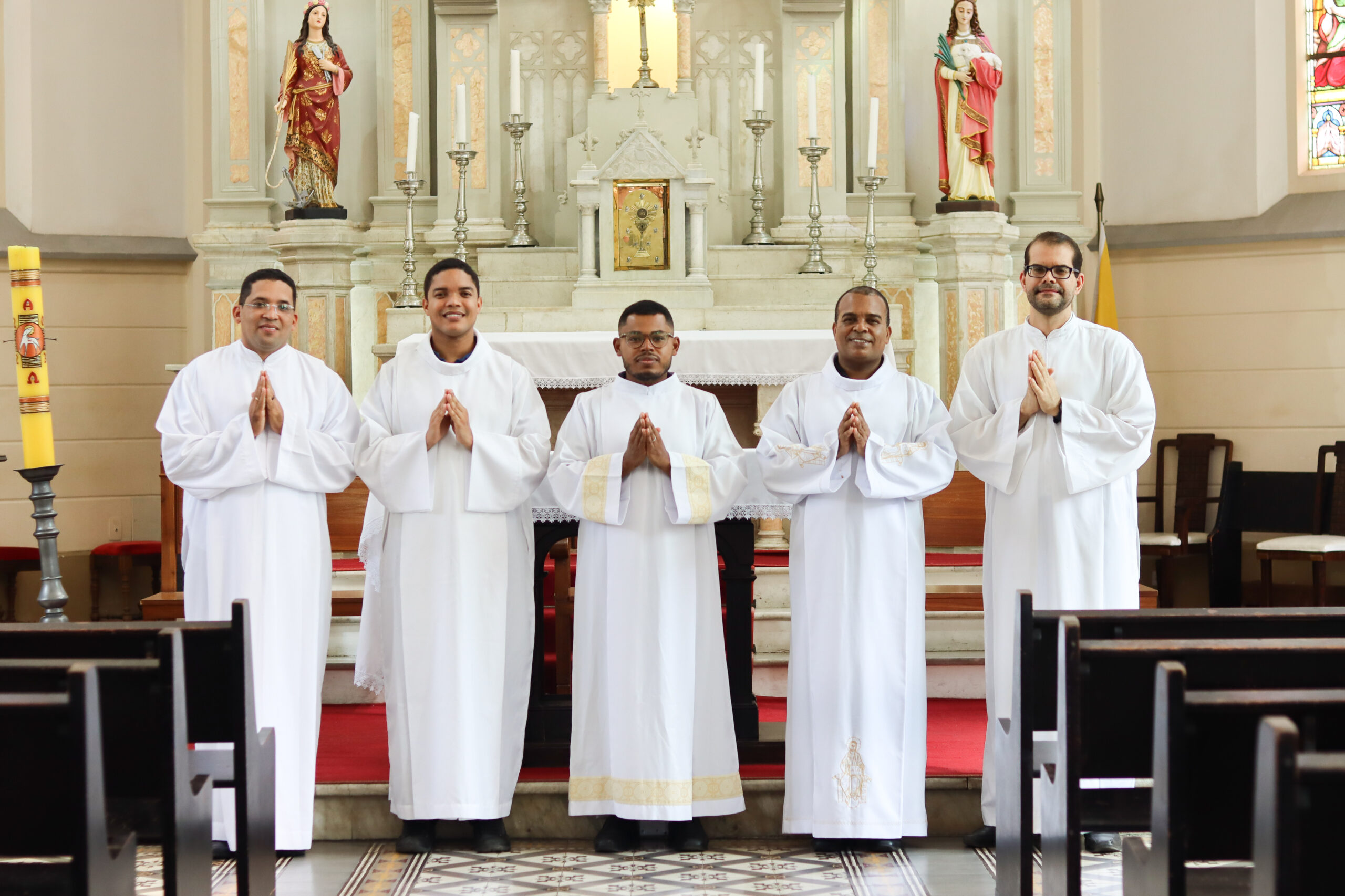 Com os olhos fixos em Jesus e sob o manto da Virgem Maria, quatro seminaristas da Arquidiocese de Salvador (Caio Silva, Carlos Manuel, Jorge Valois e Pedro Azevedo) e um da Congregação de Jesus e Maria – Padres Eudistas (Marcelo Pereira de Sousa) serão ordenados diáconos transitórios, neste sábado, 3 de junho, pelas mãos do Arcebispo de São Salvador da Bahia e Primaz do Brasil, Cardeal Dom Sergio da Rocha. A Celebração Eucarística que conferirá o primeiro grau do Sacramento da Ordem acontecerá no Santuário Nossa Senhora da Conceição Aparecida (Imbuí), às 9h.
