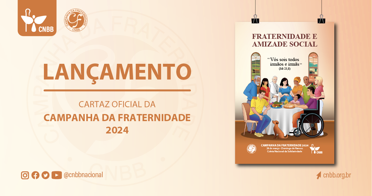 A Conferência Nacional dos Bispos do Brasil (CNBB) lançou nesta terça-feira, 25 de julho, o cartaz e a oração da Campanha da Fraternidade 2024. Inspirada na Encíclica do Papa Francisco, Fratelli Tutti, a Campanha da Fraternidade (CF) de 2024 tem como tema: “Fraternidade e Amizade Social” e o lema: “Vós sois todos irmãos e irmãs” (Mt. 23, 8). Este tema e lema foram escolhidos pelo Conselho Permanente da Conferência Nacional dos Bispos do Brasil (CNBB), em novembro de 2022.