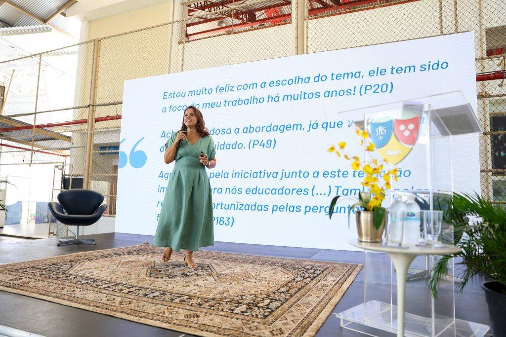 Doutora em Ciências pela Universidade de São Paulo (USP) e pesquisadora da temática do cuidar de quem cuida, Pollyana Gama fez dinâmicas com o público, promoveu reflexões a partir das próprias vivências dos educadores e mostrou dados estatísticos sobre os impactos das ações do cuidado para a saúde mental e bem-estar das relações no ambiente educacional. “Como nas recomendações de viagens aéreas, é preciso, primeiro, usar a máscara do cuidado em si próprio para depois poder cuidar melhor do outro”, frisou. Ela citou várias ações de autocuidado que vão além de realizar atividade física e cuidar da aparência, “a exemplo de cuidar dos limites em relação à alimentação, ao uso de telas e à qualidade do sono”, como exemplificou.