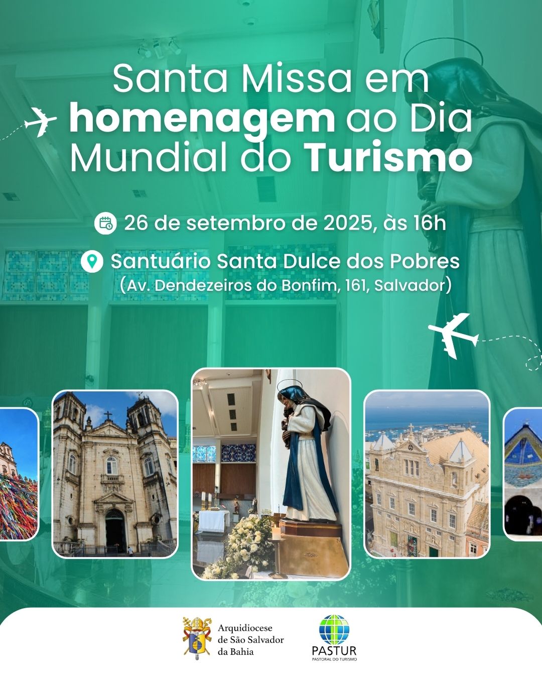 A Arquidiocese de São Salvador da Bahia celebrará, no dia 26 de setembro, às 16h, uma Missa pelo Dia Mundial do Turismo. A Celebração Eucarística acontecerá no Santuário Santa Dulce dos Pobres, localizado na Avenida Dendezeiros do Bonfim, na capital baiana, e está sendo organizada pela Pastoral do Turismo (Pastur), organismo da Arquidiocese que atua na valorização da fé, da cultura e do patrimônio religioso, buscando integrar espiritualidade e turismo.