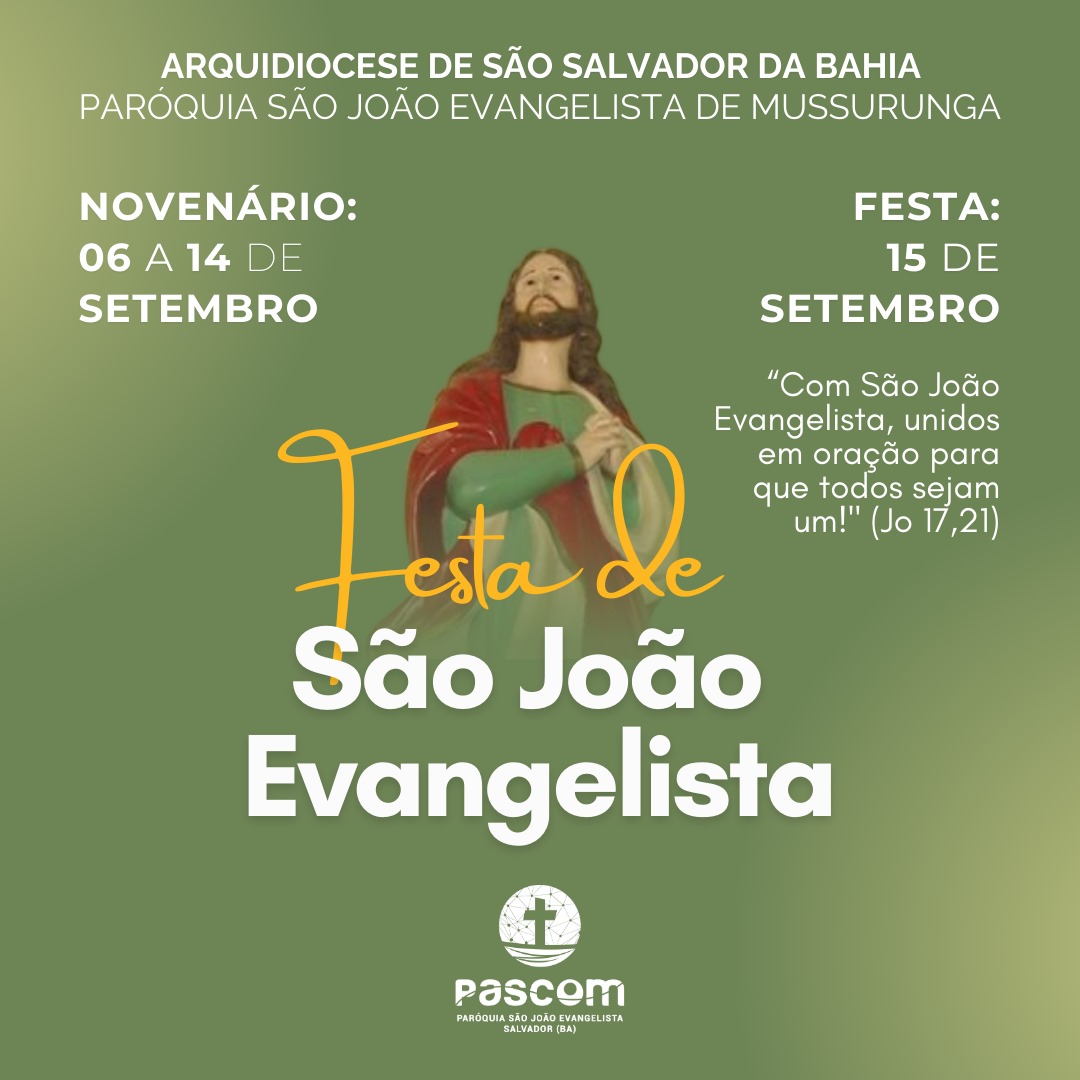 “Com São João Evangelista, unidos em oração, para que todos sejam um!” (Jo 17, 21), este é o tema da festa de São João Evangelista, o discípulo amado de Jesus, na paróquia a ele dedicada, localizada no bairro Mussurunga, em Salvador. O novenário acontecerá de 6 a 14 de setembro, sempre às 19h, na Matriz, com exceção do dia 8 (domingo), quando a Celebração Eucarística ocorrerá às 18h.
