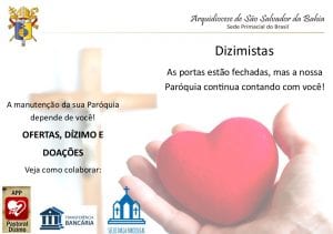 Portanto, a Pastoral do Dízimo Arquidiocesana vem por meio desta orientar que utilizemos das tecnologias para facilitar o recebimento do dízimo, ofertas e doações (online, transferência bancária, depósito e\ou presencial nas secretarias paroquiais), para que nossas Igrejas continuem honrando com os devidos compromissos.