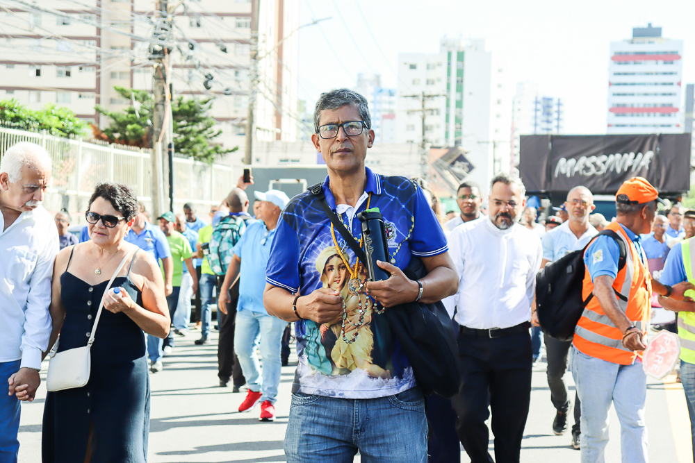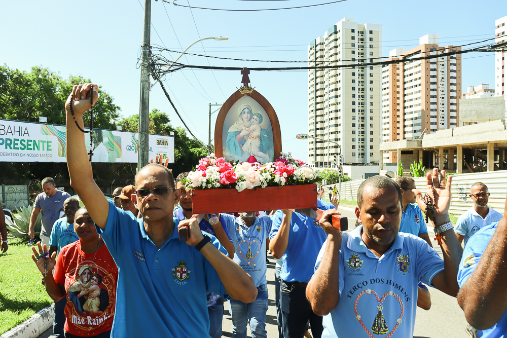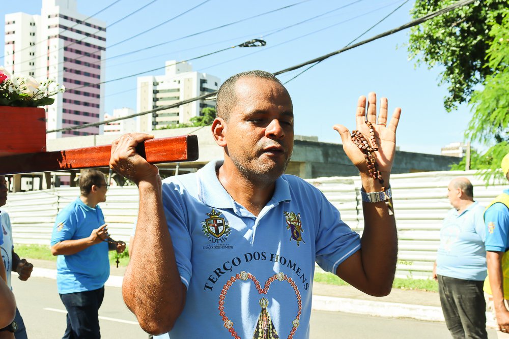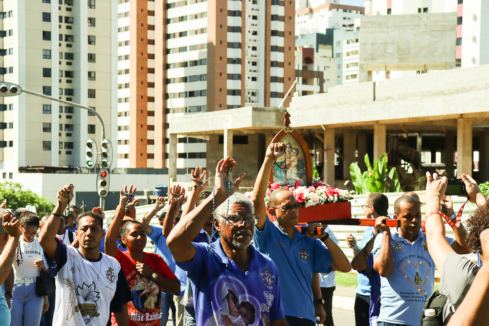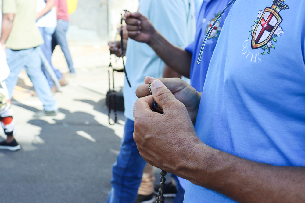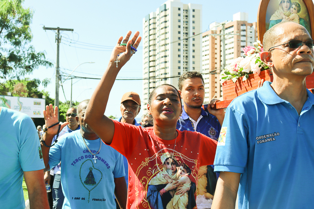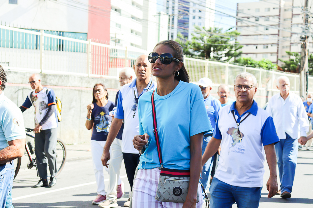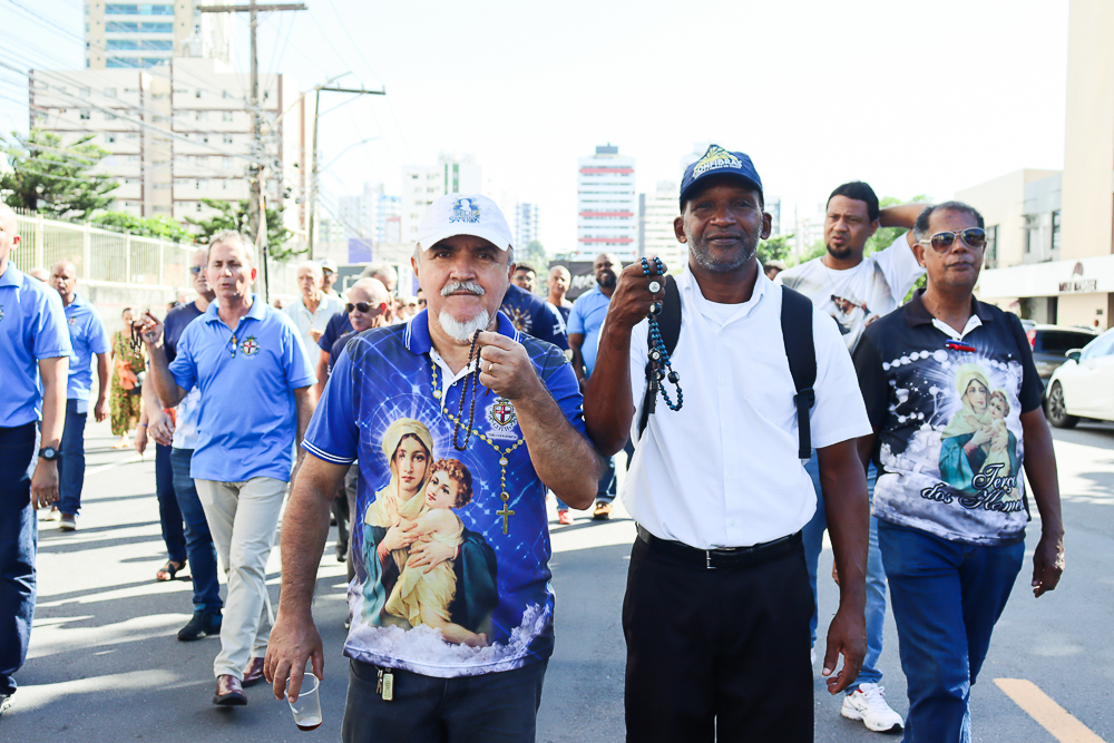 Logo após a Santa Missa, carregando a capelinha da Mãe, Rainha e Vencedora Três Vezes Admirável de Schoenstatt, os devotos seguiram em direção ao Santuário que leva este mesmo título mariano, localizado no bairro Stiep. Alegres e, ao mesmo tempo, contritos, os fiéis percorreram algumas ruas, subiram e desceram ladeiras. Nas mãos: o Terço. “Para mim, participar da Caminhada com Maria representa uma glória de Deus. É uma missão que Nossa Senhora me confiou”, disse o membro do GOTH’s da Basílica Santuário Nossa Senhora da Conceição da Praia, Manuel Almeida.