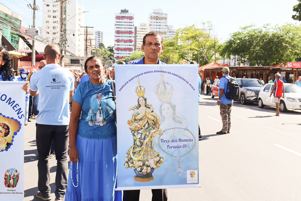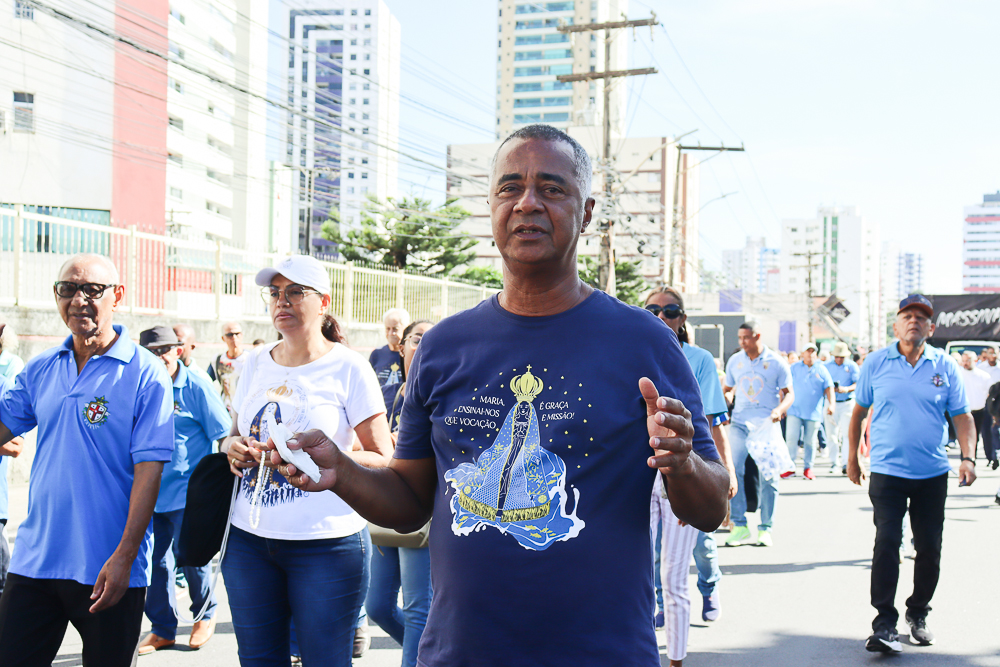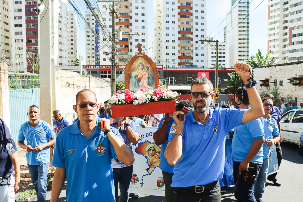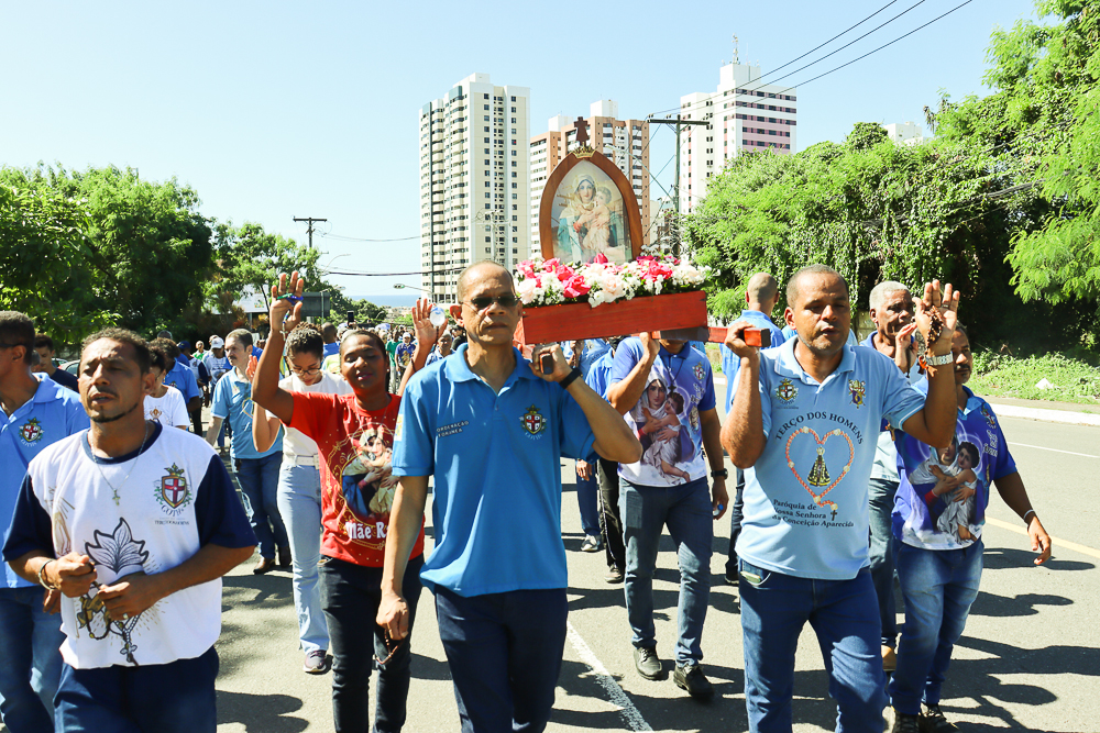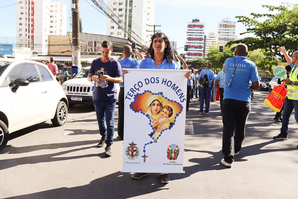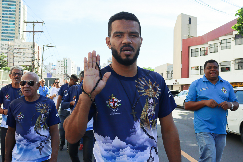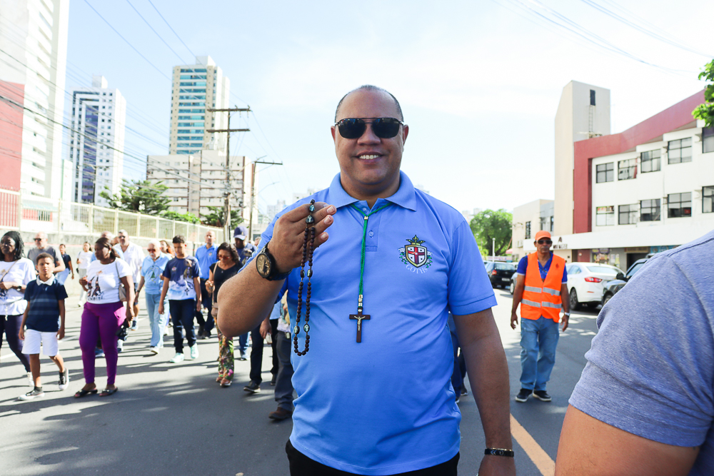 Logo após a Santa Missa, carregando a capelinha da Mãe, Rainha e Vencedora Três Vezes Admirável de Schoenstatt, os devotos seguiram em direção ao Santuário que leva este mesmo título mariano, localizado no bairro Stiep. Alegres e, ao mesmo tempo, contritos, os fiéis percorreram algumas ruas, subiram e desceram ladeiras. Nas mãos: o Terço. “Para mim, participar da Caminhada com Maria representa uma glória de Deus. É uma missão que Nossa Senhora me confiou”, disse o membro do GOTH’s da Basílica Santuário Nossa Senhora da Conceição da Praia, Manuel Almeida.