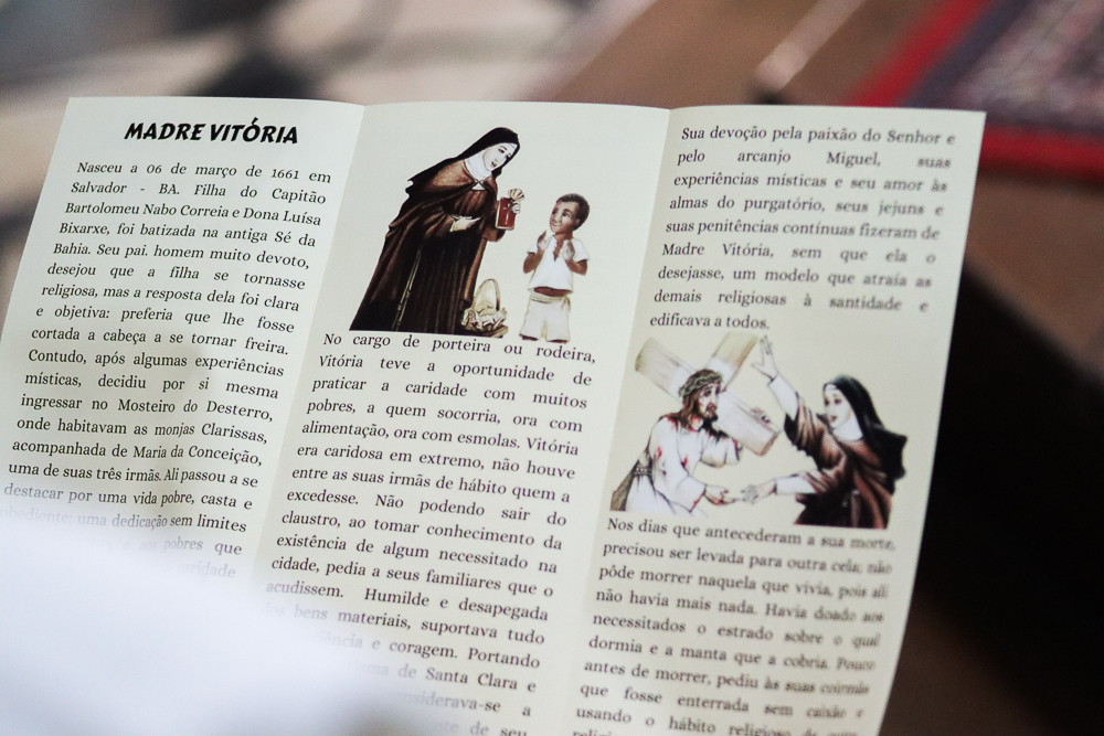 “Na pesquisa, nós encontramos dados interessantes que situam a Madre Vitória da Encarnação em um contexto, em uma época, sempre atestando a sua boa fama e a sua vida cheia de virtudes. Pesquisar sobre a Madre Vitória foi uma oportunidade para aprender mais sobre ela. Ao descobrir que uma religiosa com uma envergadura tamanha no âmbito da caridade, da mística, da penitência ainda era pouco conhecida, me motivei a divulgá-la e tomei-a mesmo como protetora, como intercessora, virando o seu devoto”, disse o professor Thiago Felipe Lima da Mata, devoto que fez parte da Comissão Histórica do Processo de Beatificação e Canonização da Serva de Deus Vitória da Encarnação.
