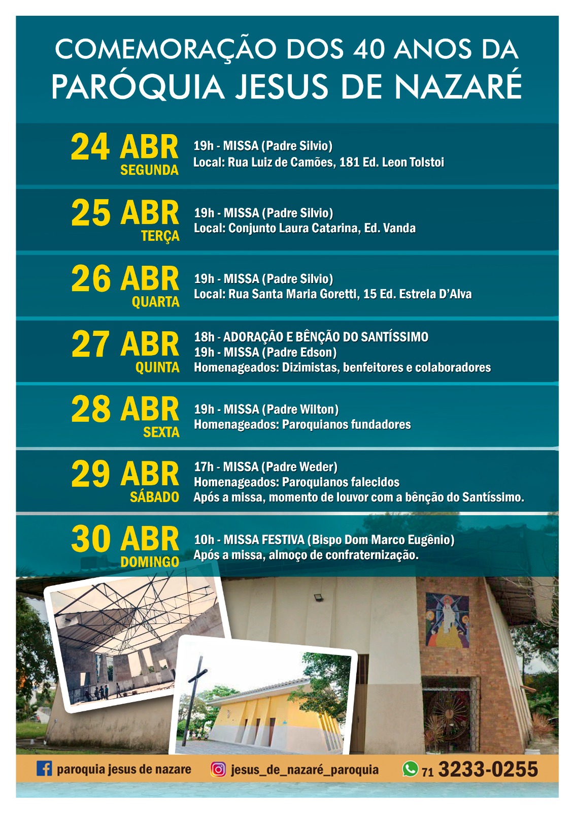 Em ação de graças a Deus pelos 40 anos da Paróquia Jesus de Nazaré – completados em janeiro deste ano -, a comunidade participa de uma programação especial neste mês de abril. De 24 a 30, serão celebradas Missas em diferentes horários e locais. Confira: