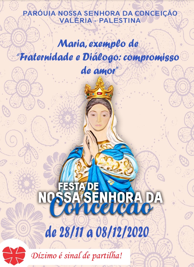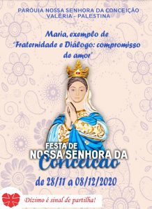 Com o tema “Maria, exemplo de ‘Fraternidade e Diálogo: compromisso de amor’”, a Paróquia Nossa Senhora da Conceição, localizada no bairro de Valéria, também realiza o novenário em preparação à Festa da Padroeira, de 29 de novembro a 7 de dezembro, sempre às 19h, com exceção dos dias 29 e 6, quando os devotos se reúnem às 18h. Na véspera da abertura do novenário, portanto dia 28 de novembro, haverá o traslado da imagem da Mãe de Jesus, que será conduzida da Igreja Matriz até o Centro de Evangelização Sagrada Família (CESF), após a Missa das 18h30.
