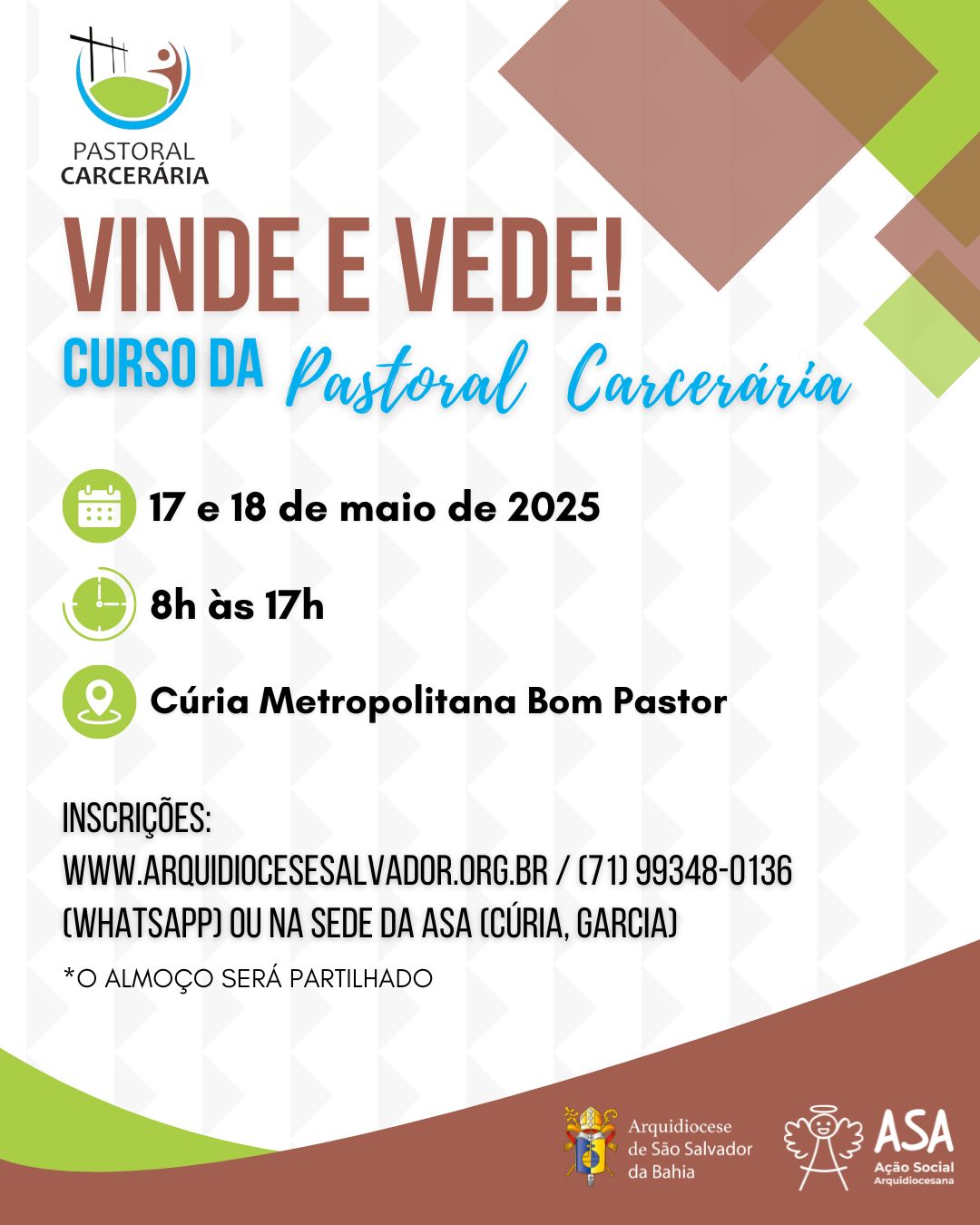 Nos dias 17 e 18 de maio de 2025, a Pastoral Carcerária da Arquidiocese de São Salvador da Bahia realizará o curso “Vinde e Vede!”, voltado para formação de novos agentes e fortalecimento da missão evangelizadora junto às pessoas privadas de liberdade. A iniciativa acontecerá das 8h às 17h, na Cúria Metropolitana Bom Pastor, localizada na Avenida Leovigildo Filgueiras, 270, bairro Garcia.
