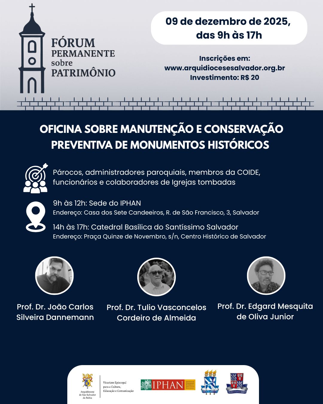 A Arquidiocese de São Salvador da Bahia, através do Vicariato Episcopal para a Cultura, Educação e Comunicação, promoverá mais uma edição do Fórum Permanente sobre Patrimônio, com a “Oficina de Manutenção e Conservação Preventiva de Monumentos Históricos”. A atividade acontecerá no dia 09 de dezembro de 2025, com a parte teórica das 9h às 12h, na Sede do IPHAN (Casa dos Sete Candeeiros, R. de São Francisco, 3, Salvador) e com a parte prática das 14h às 17h, na Catedral Basílica do Santíssimo Salvador (Praça Quinze de Novembro, s/n, Salvador). O investimento é no valor de R$ 20.