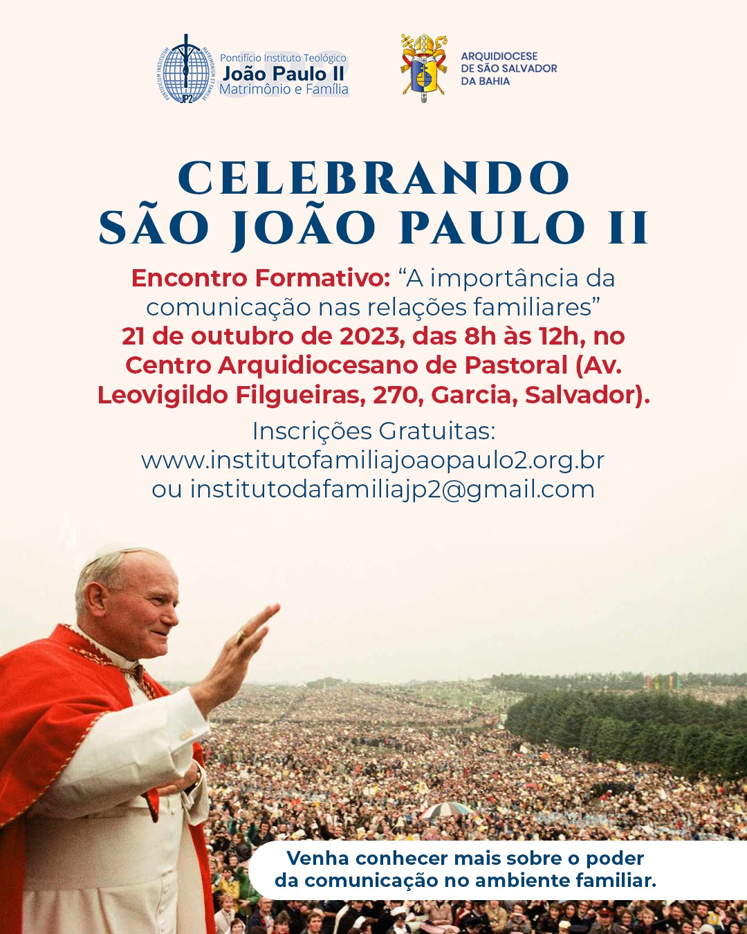 O Pontifício Instituto Teológico João Paulo II para Ciências do Matrimônio e da Família segue com inscrições abertas para o curso formativo, que terá como tema “A importância da comunicação nas relações familiares”. A atividade acontecerá no dia 21 de outubro, das 8h às 12h, no Centro Arquidiocesano de Pastoral, da Cúria Metropolitana de Salvador, localizado no Garcia. Não há taxa de inscrição, mas o interessado deve garantir a participação enviando um e-mail para institutodafamiliajp2@gmail.com