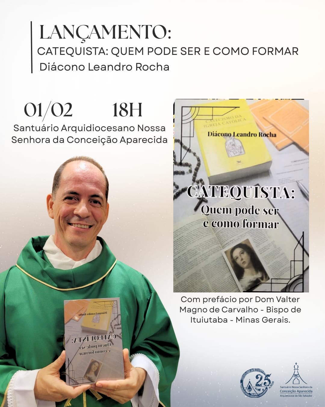 Será lançado neste domingo, 1º de fevereiro, às 18h, o livro “Catequista: quem pode ser e como formar”, de autoria do diácono permanente Leandro Rocha. O evento acontecerá no Santuário Arquidiocesano Nossa Senhora da Conceição Aparecida, localizado na Rua das Araras, 1219, Imbuí, Salvador.