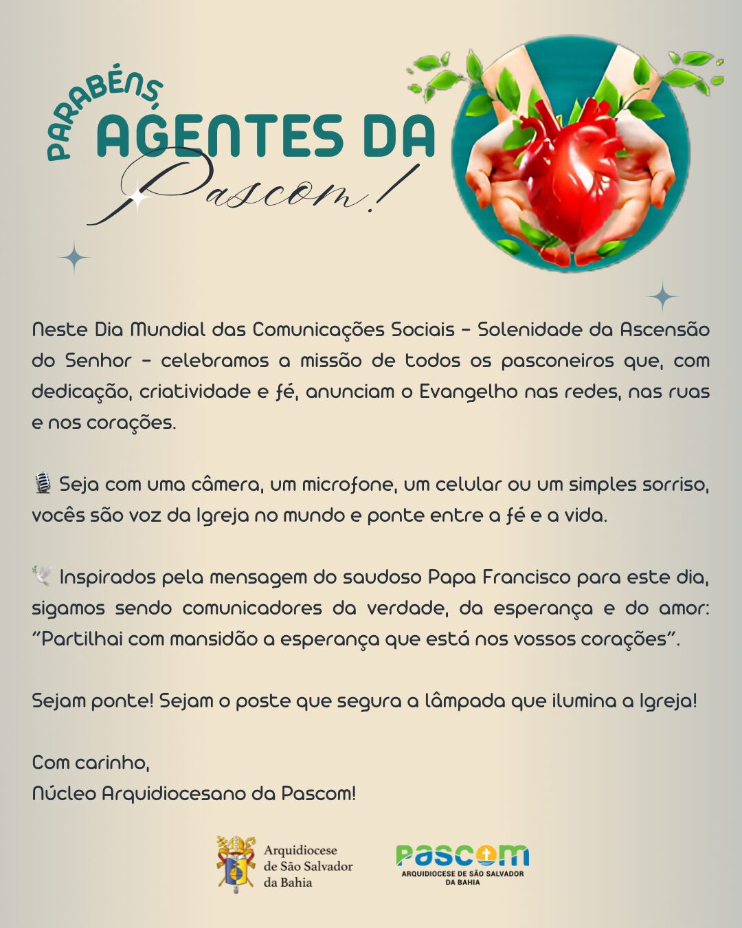 Neste Dia Mundial das Comunicações Sociais (DMCS), celebrado na Solenidade da Ascensão do Senhor, o Núcleo Arquidiocesano da Pastoral da Comunicação (Pascom) enviou uma mensagem reconhecendo e agradecendo a missão e o trabalho de cada agente. Confira: