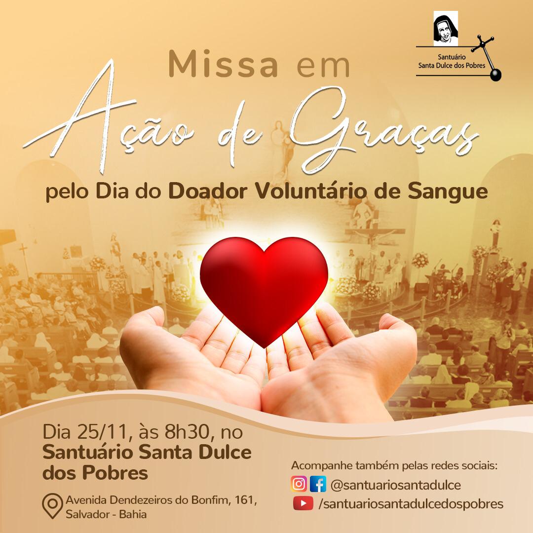 O Dia do Doador Voluntário de Sangue, comemorado na próxima quarta-feira (25 de novembro), será marcado por uma Missa em Ação de Graças no Santuário Santa Dulce dos Pobres. A