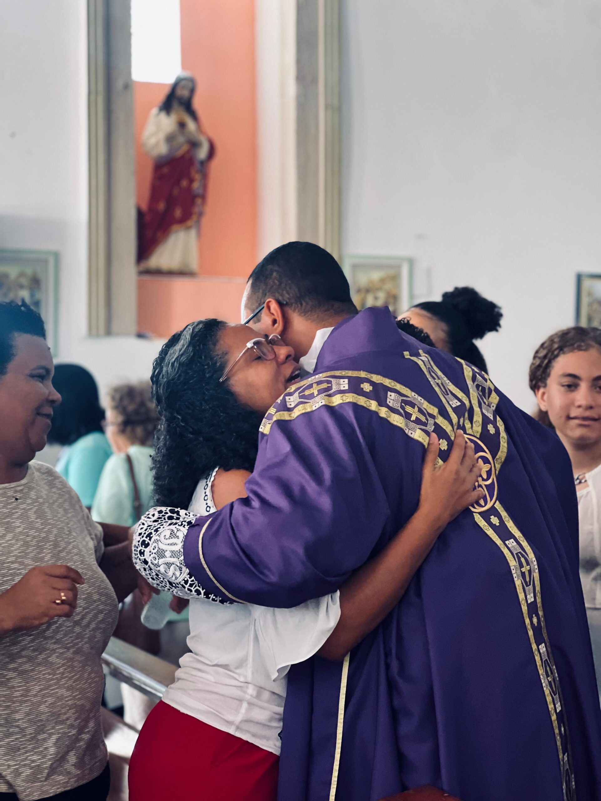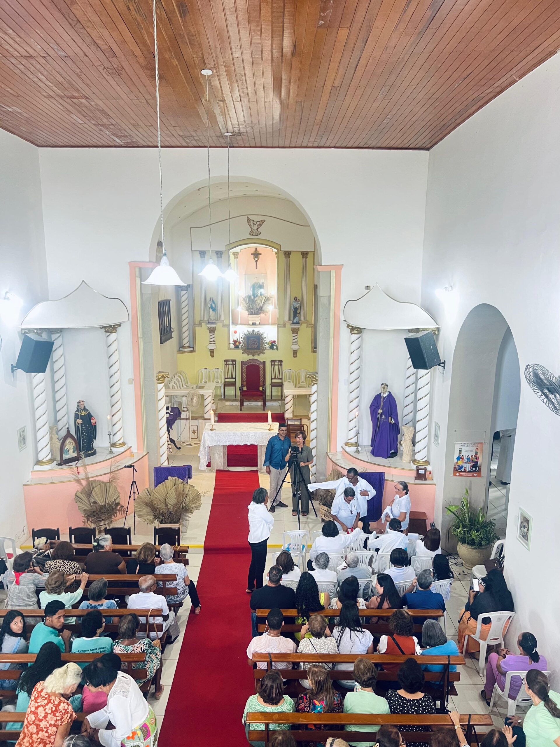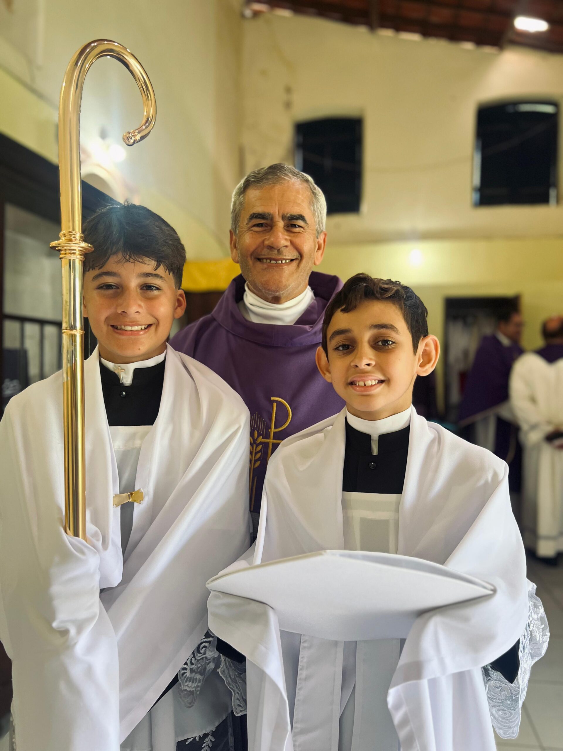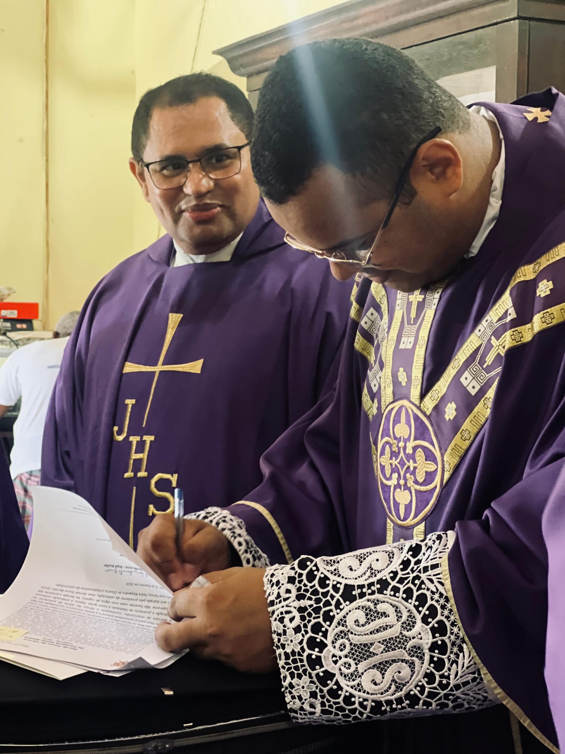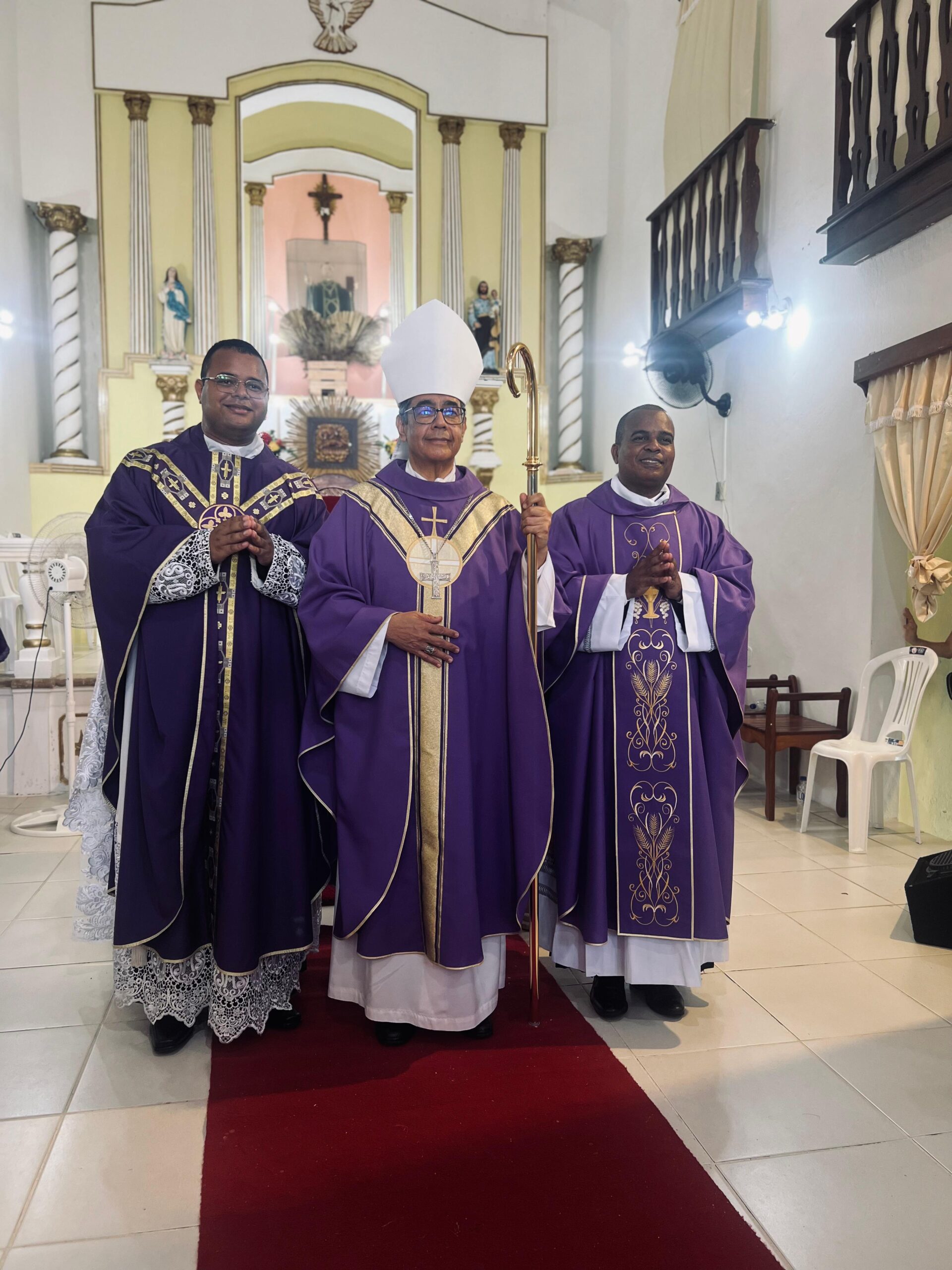 Os sacerdotes são pároco (padre Alexandre) e vigário (padre Carlos Manuel), respectivamente