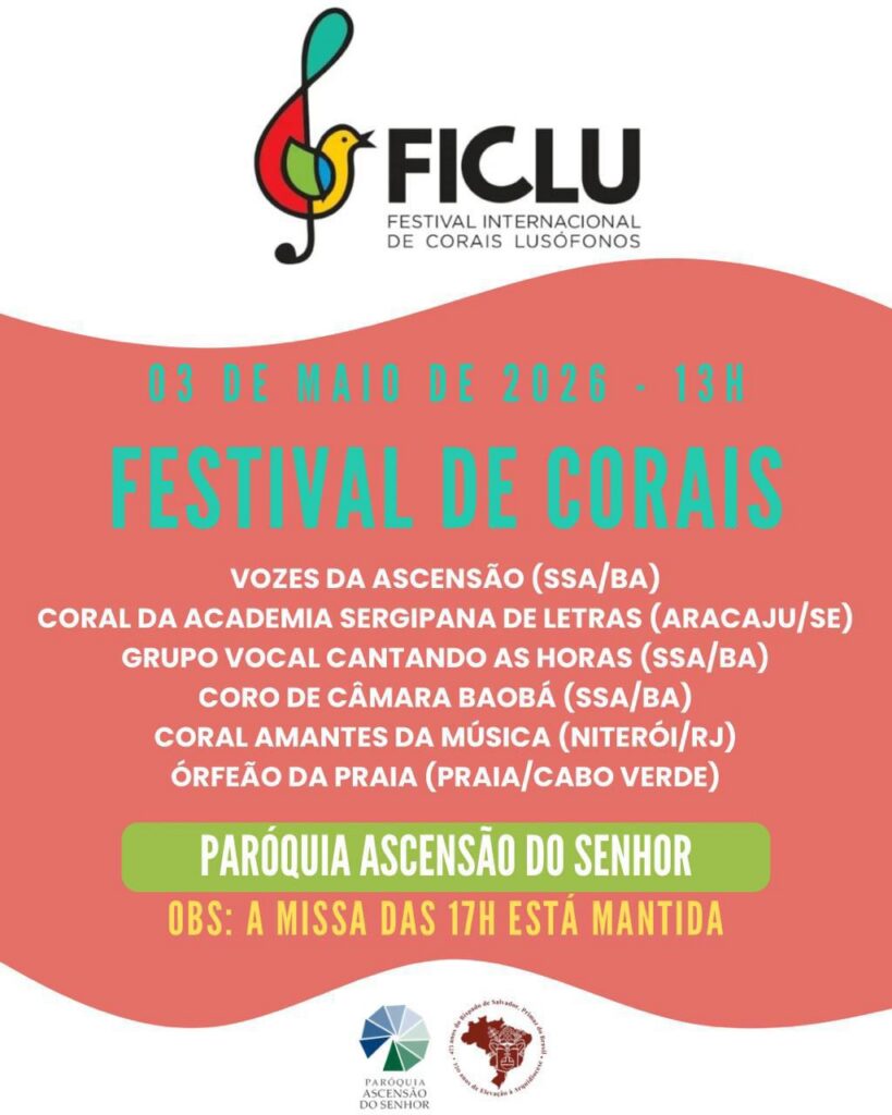 A Paróquia Ascensão do Senhor sediará o Festival Internacional de Corais Lusófonos (FICLU), que acontecerá no próximo dia 3 de maio, a partir das 13h, reunindo diferentes grupos em um momento de arte, cultura e espiritualidade. A apresentação contará com a participação do Coral Vozes da Ascensão (Salvador/BA), anfitrião do evento, além do Coral da Academia Sergipana de Letras (Aracaju/SE), do Grupo Vocal Cantando as Horas (Salvador/BA), do Coro de Câmara Baobá (Salvador/BA), do Coral Amantes da Música (Niterói/RJ) e do Órfão da Praia (Praia/Cabo Verde). A diversidade dos grupos reforça o caráter internacional do festival, promovendo o intercâmbio cultural entre países e regiões de língua portuguesa.