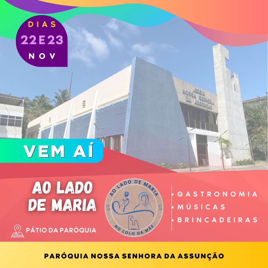 A Paróquia Nossa Senhora da Assunção, localizada no bairro Pituba, em Salvador, realizará a primeira edição do evento “Ao lado de Maria”, à luz do tema “No Colo da Mãe”. A atividade acontecerá nos dias 22 (das 19h às 22h) e 23 de novembro (das 16h30 às 20h30), no pátio da Matriz, com diversas ações de entretenimento e lazer, como barracas temáticas de alimentação, artesanatos, apresentações musicais, além de várias atividades para toda a família.