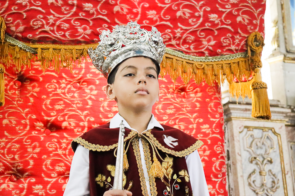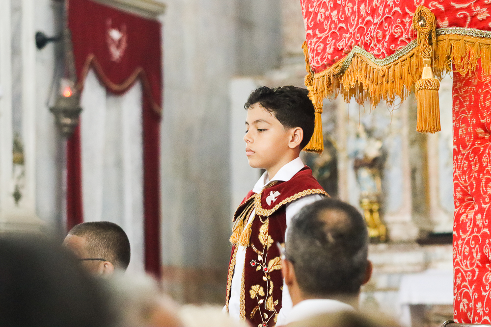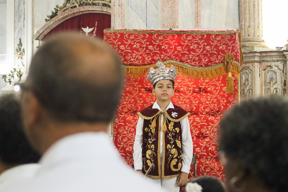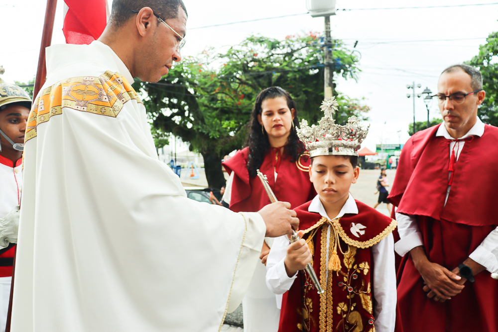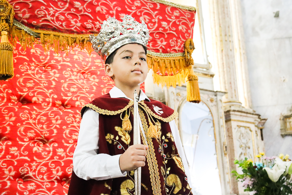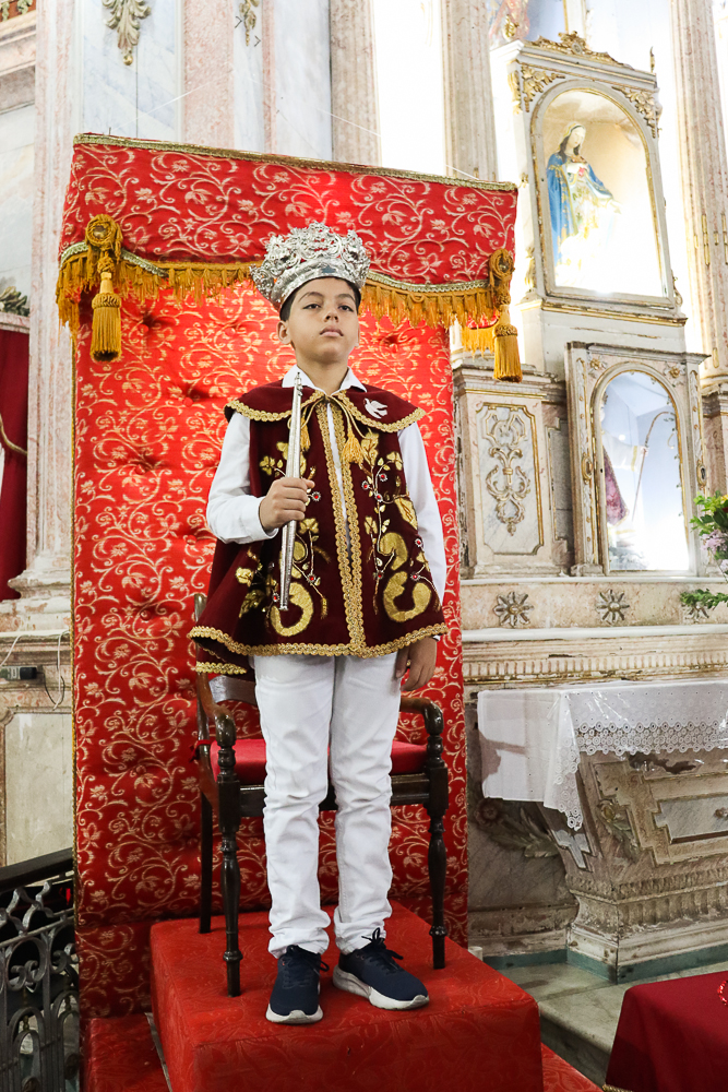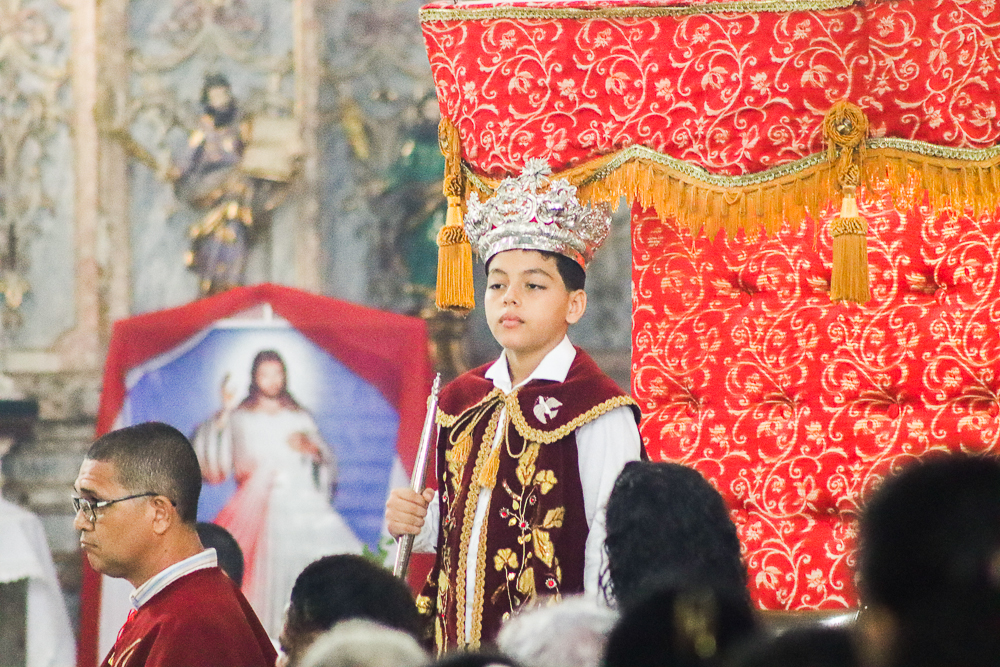 Tradicionalmente, nos sete domingos que precedem a Solenidade de Pentecostes, um menino é coroado, representando o imperador – fazendo alusão ao início destes festejos no Brasil, que já tem 254 anos. Assim, antes do cortejo processional, o padre Jailson coroou Lucas Souza Santos, na porta do templo, que também recebeu e beijou o cedro. Em seguida, o menino imperador sentou em um local preparado para ele.