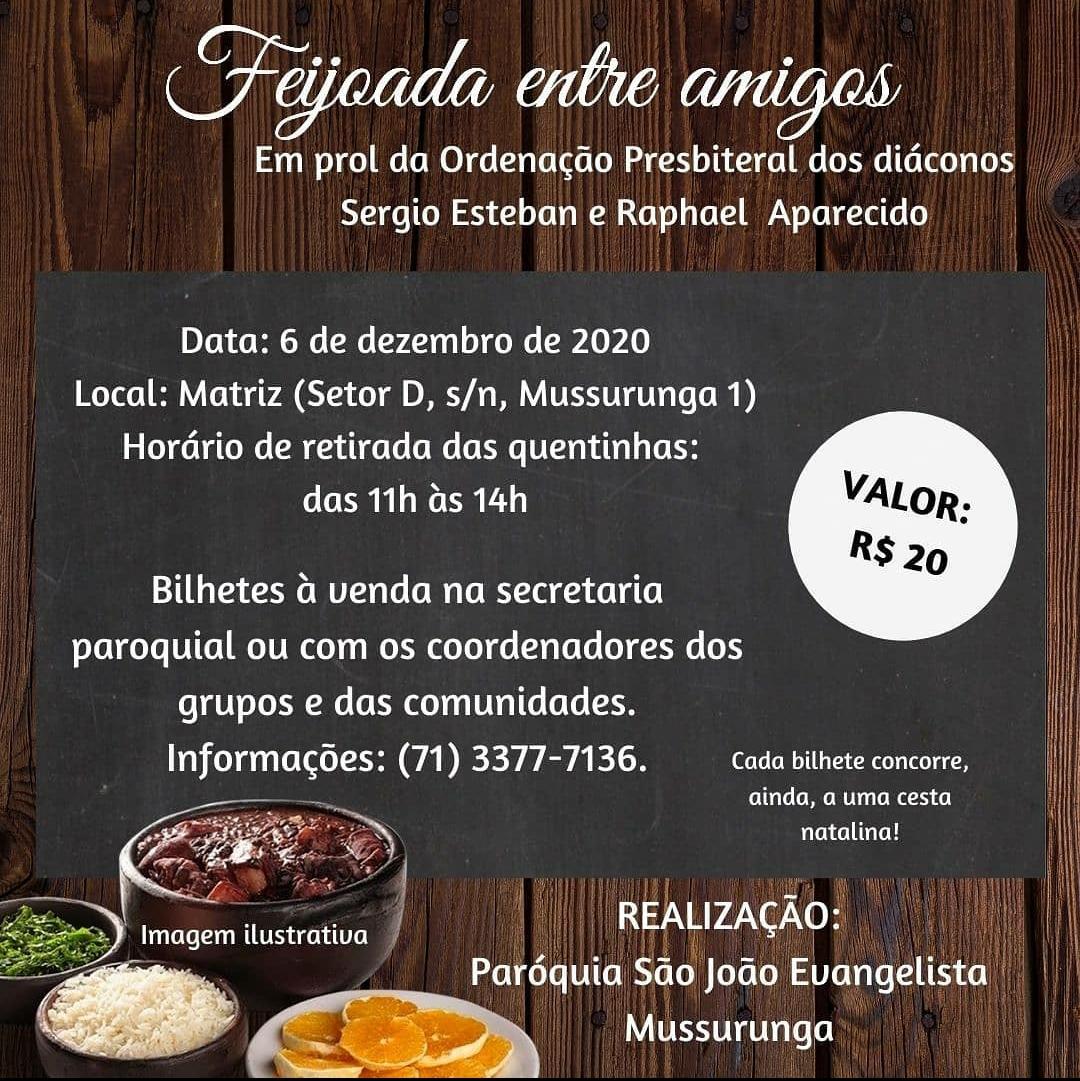 Com o objetivo de arrecadar recursos financeiros para ajudar os diáconos transitórios Raphael Aparecido e Sergio Esteban, que serão ordenados sacerdotes no dia 23 de dezembro, a Paróquia São João Evangelista (Mussurunga), promove, no dia 6 de dezembro, a Feijoada Entre Amigos.