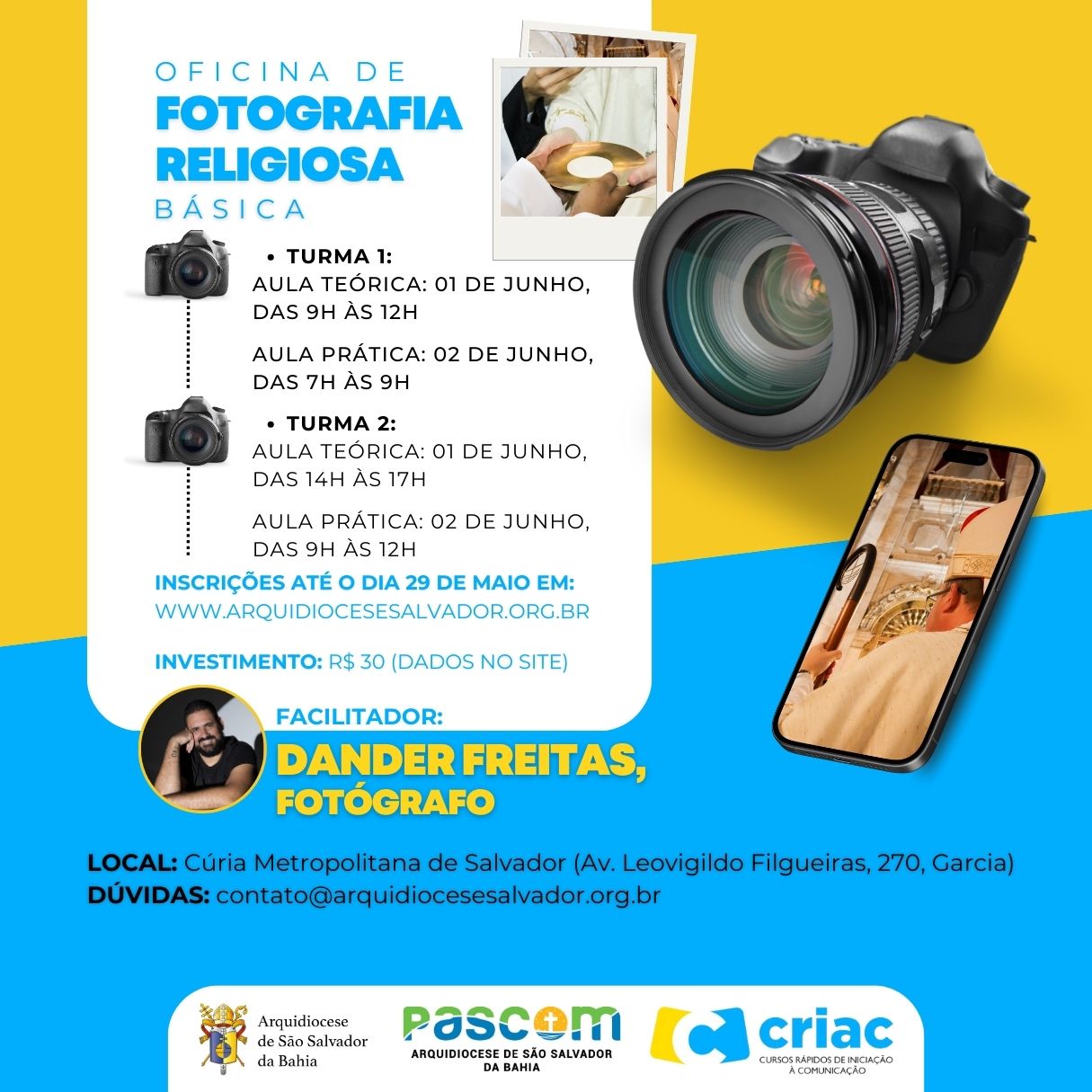 A iniciativa acontecerá com duas turmas, ambas com aulas nos dias 1º e 2 de junho, na Cúria Metropolitana de Salvador (Avenida Leovigildo Filgueiras, 270, Garcia). As inscrições podem ser realizadas através do formulário [CLIQUE AQUI E GARANTA A SUA VAGA!]. Neste mesmo endereço estão disponíveis as informações sobre o pagamento da taxa, no valor de R$ 30. As vagas são limitadas.
