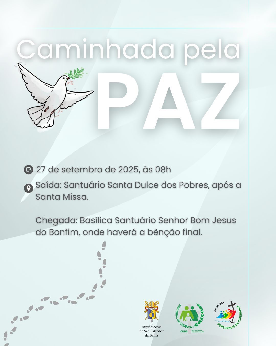 No próximo dia 27 de setembro, a Arquidiocese de São Salvador da Bahia, através da Pastoral da Criança, realizará mais uma edição da Caminhada pela Paz, iniciativa que reunirá fiéis e comunidade em um gesto de fé e fraternidade. A programação terá início às 8h, com a Missa no Santuário Santa Dulce dos Pobres (Avenida Dendezeiros do Bonfim, 161, Salvador). Logo após a Celebração Eucarística, os participantes seguirão em caminhada em direção à Basílica Santuário Senhor Bom Jesus do Bonfim, onde será concedida a bênção final.