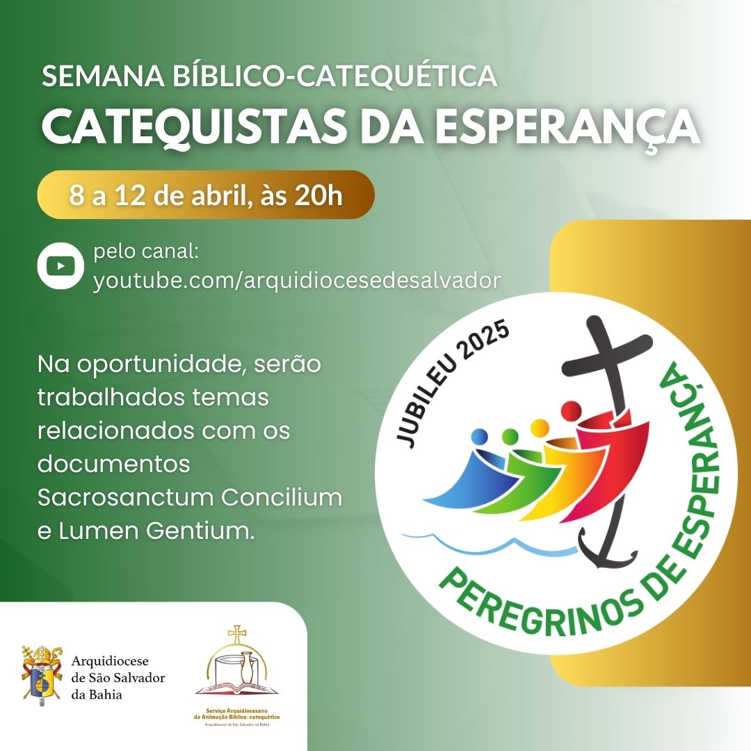 O Serviço de Animação Bíblico-catequético da Arquidiocese de São Salvador da Bahia promove, de 8 a 12 de abril, a Semana Bíblico-Catequética. A iniciativa, que é voltada, de modo especial, para os catequistas, acontece na modalidade online, sempre com início às 20h, pelo canal youtube.com/arquidiocesedesalvador