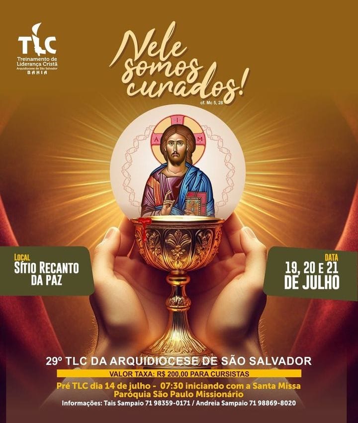 Com o tema “Nele somos curados!”, o movimento TLC (Treinamento de Liderança Cristã), promoverá o 29° retiro para adultos e jovens, a partir dos 17 anos, que tenham interesse em viver um encontro profundo com Cristo. O encontro acontecerá nos dias 19, 20 e 21 de julho, no sítio Recanto da Paz, em Abrantes, e as inscrições já podem ser realizadas, através do formulário cujo link está disponível na bio do Instagram @movimentotlcsalvador
